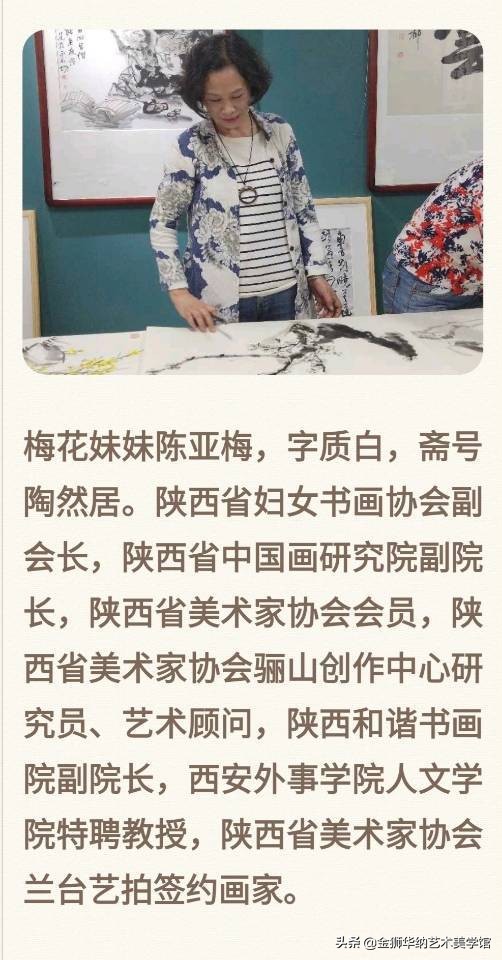 陈亚梅,女,字质白,斋号陶然居。陕西省妇女书画协会副会长,陕西省中国画研究院副院长,陕西省美术家协会会员,陕西省美术家协会骊山创作中心研究员、艺术顾问,陕西和谐书画院副院长,西安外事学院人文学院特聘教授,陕西省美术家协会兰台艺拍签约画家。