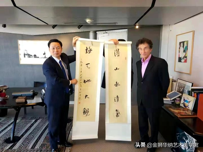 文化和旅游部国际交流与合作局副局长张西龙(图左)向法国文化部部长(图右)赠送李玉田书法作品
