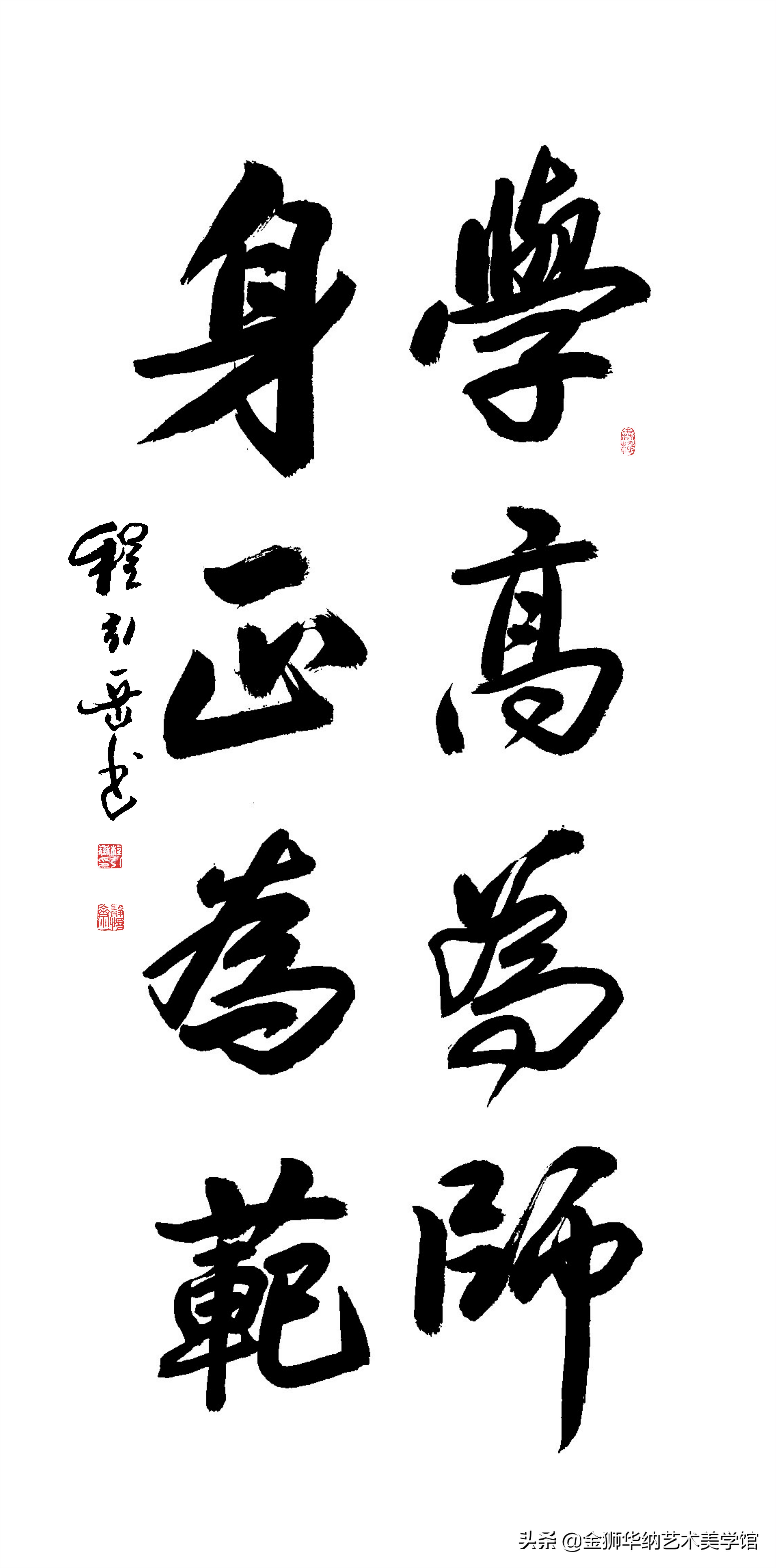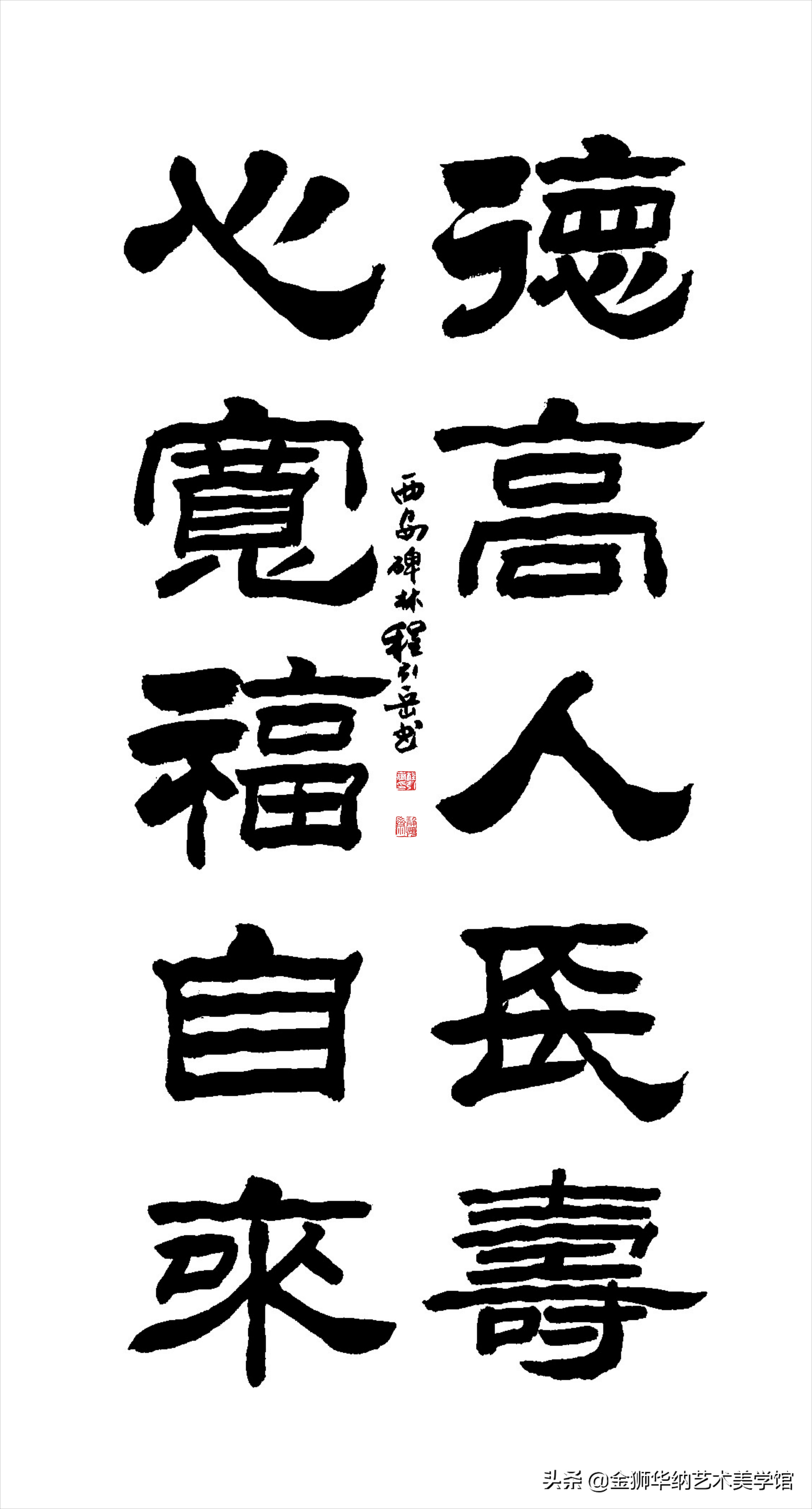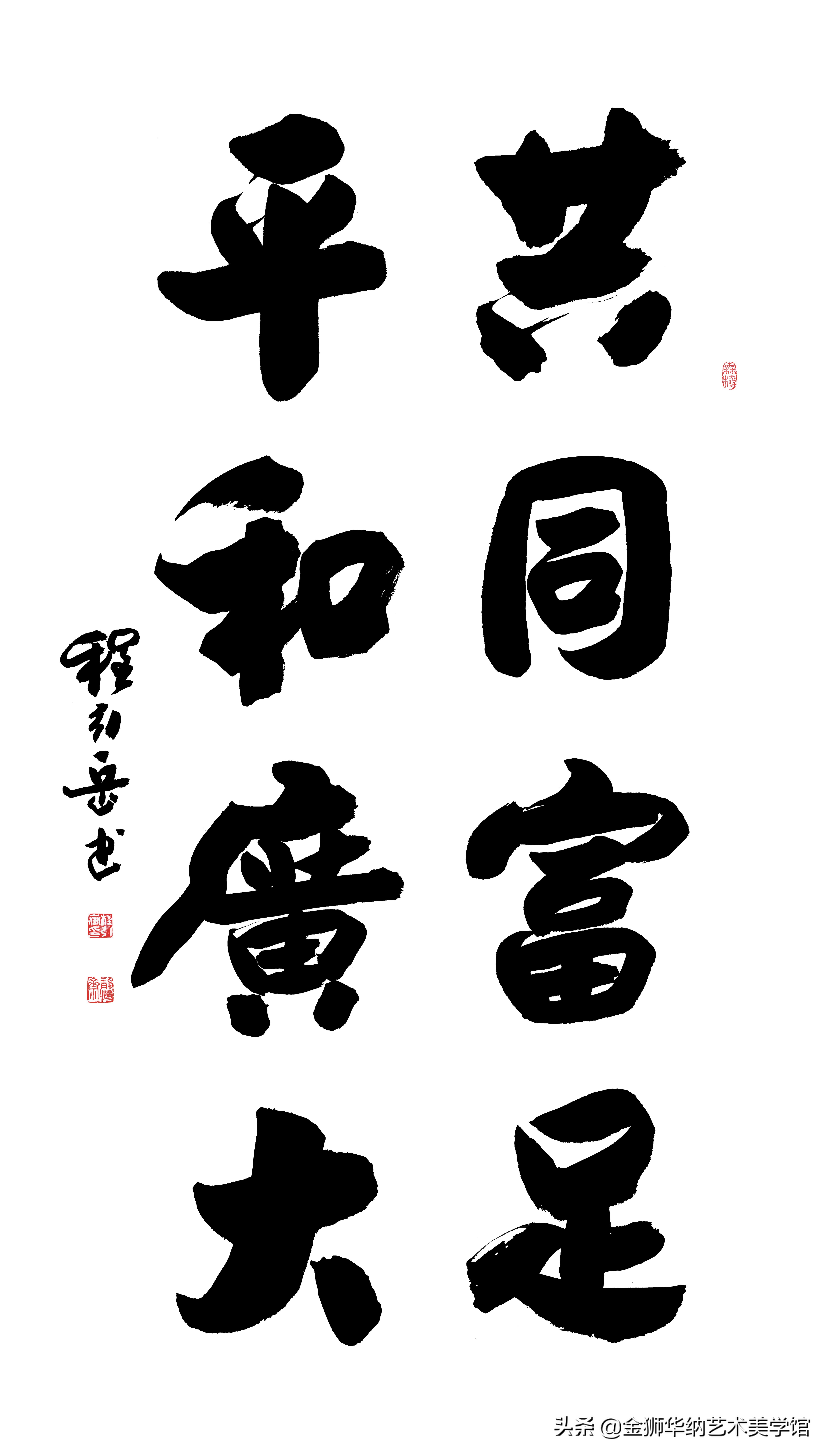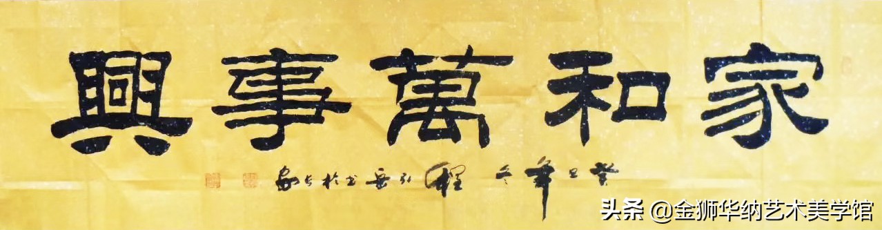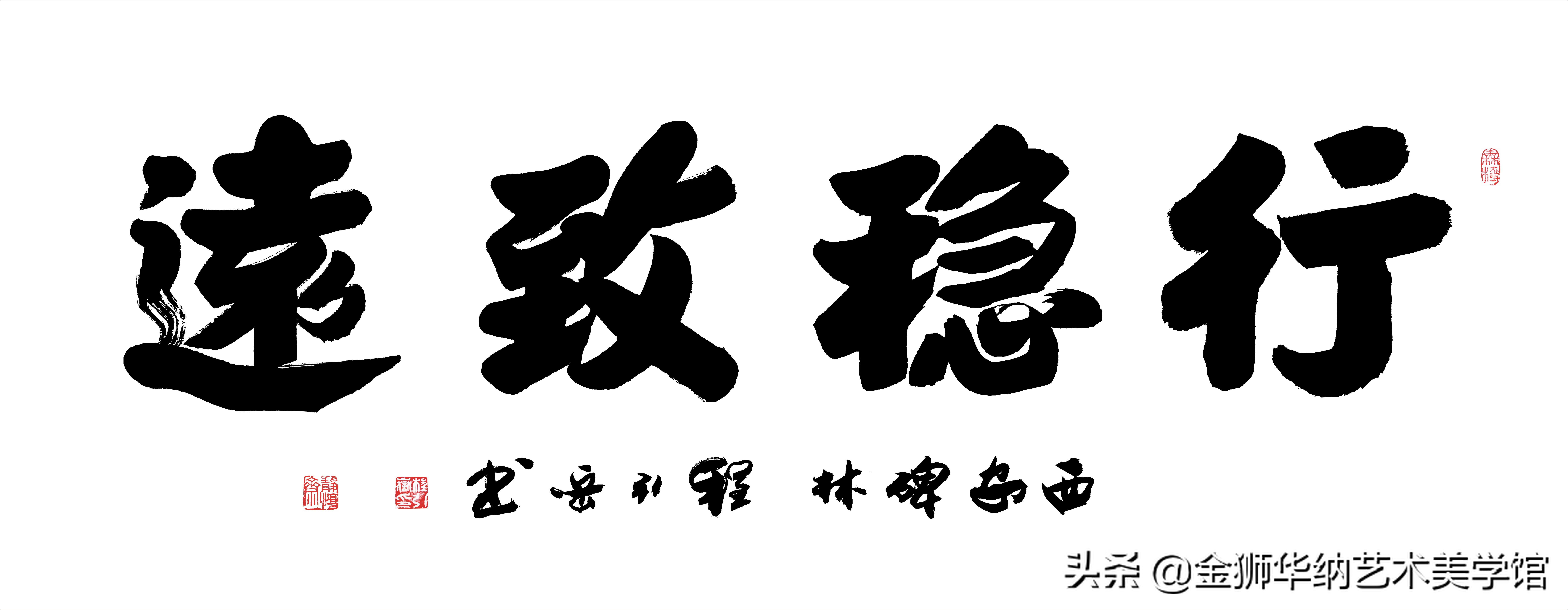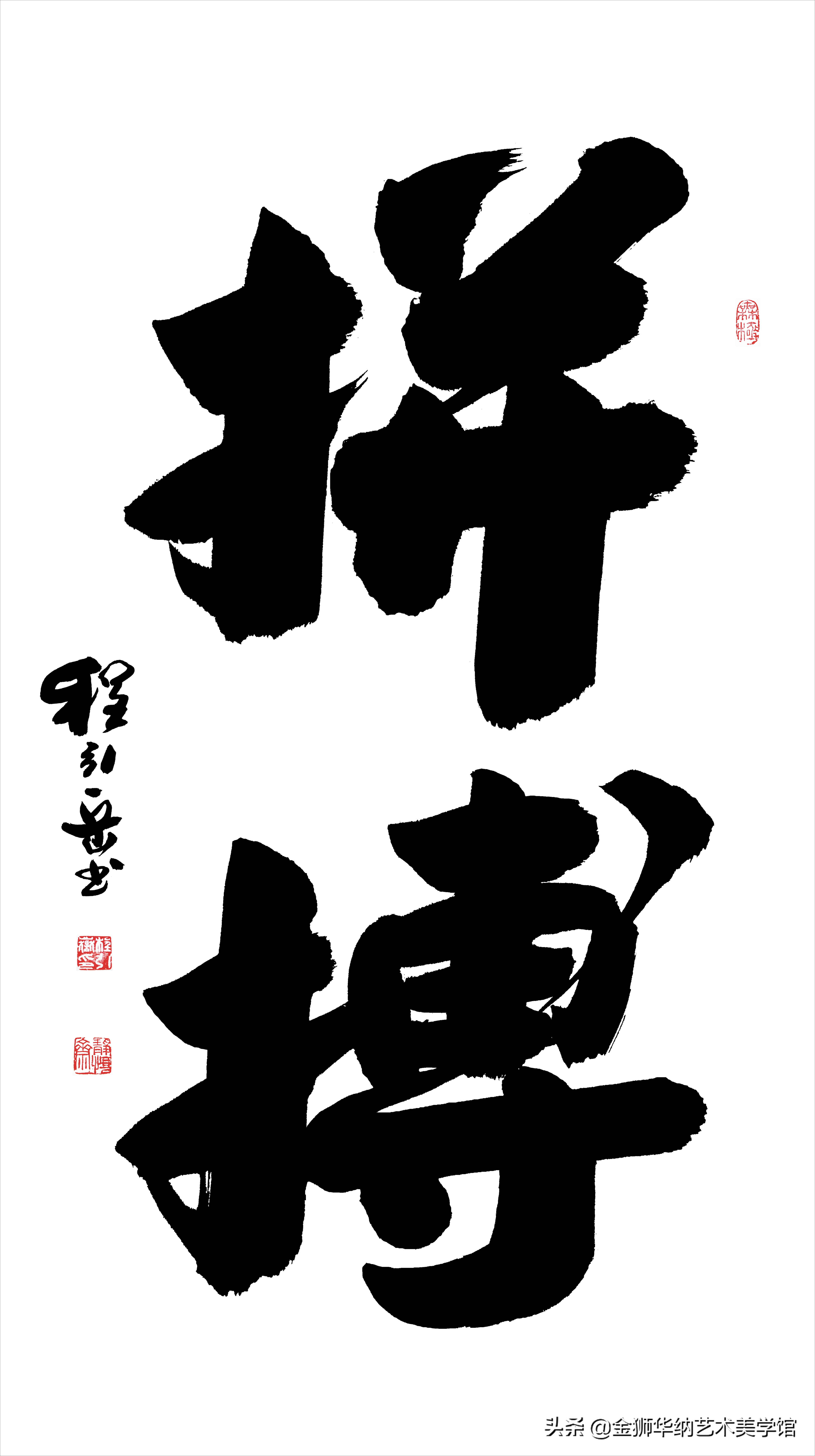 程引岳先生的榜书艺术融汇了颜体,柳体等百家之长,体兼众美,他推陈出新,顺应时代书法艺术发展的新趋势和新特点,赋予了榜书字体新内涵,开拓了书法的表现力,是中国书法艺术走向成熟的一个显著的标志,是榜书大字重新登上大雅之堂的抗鼎力作。
