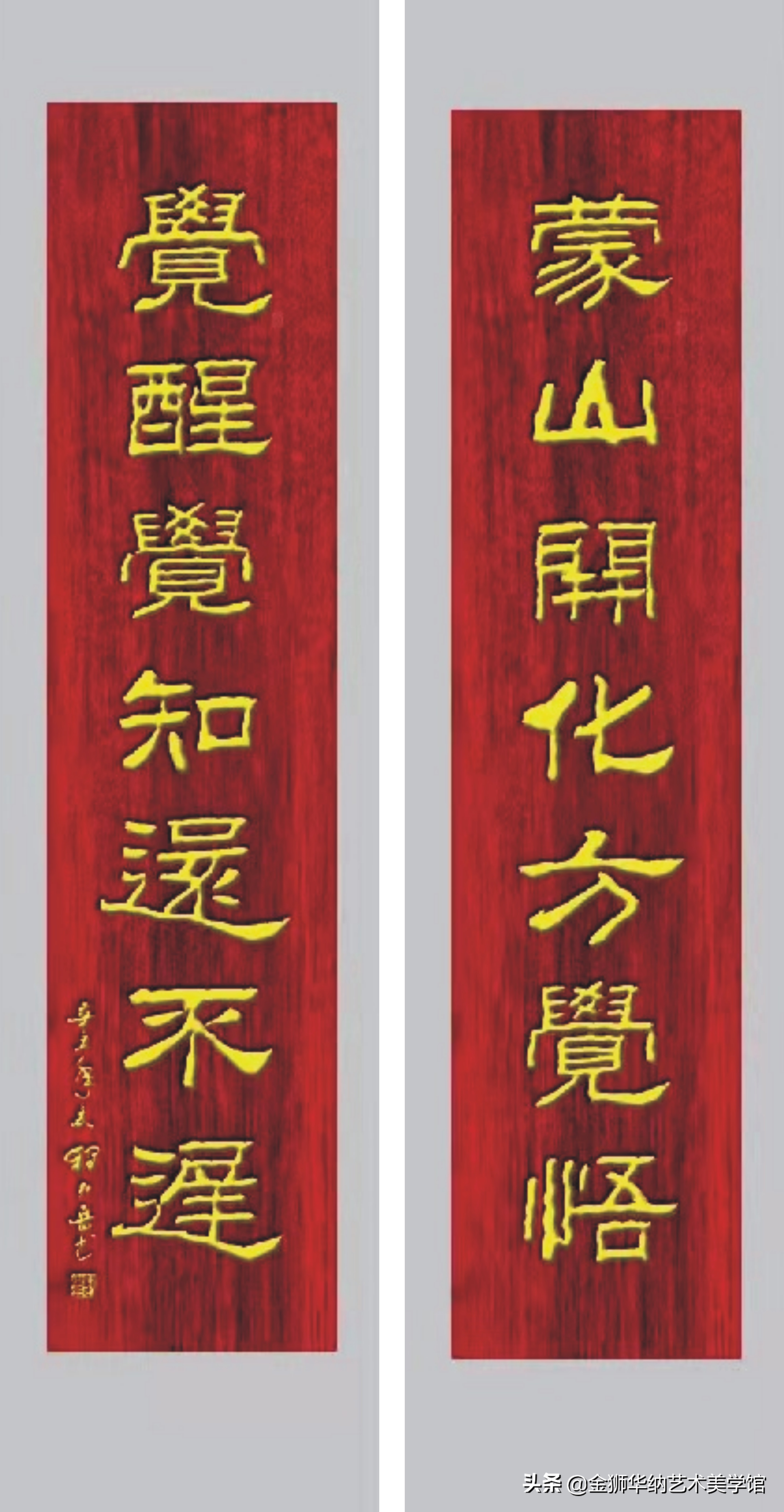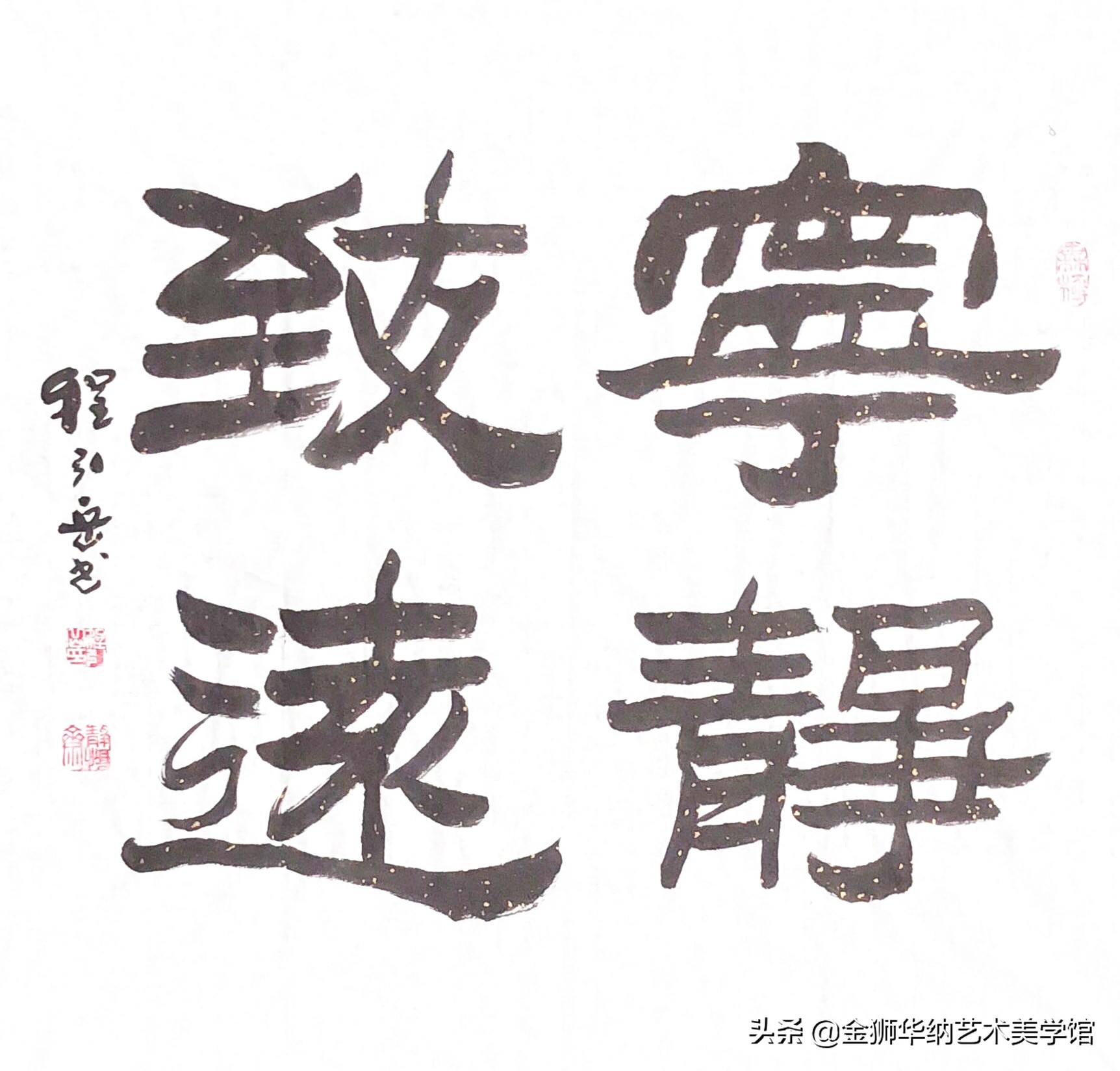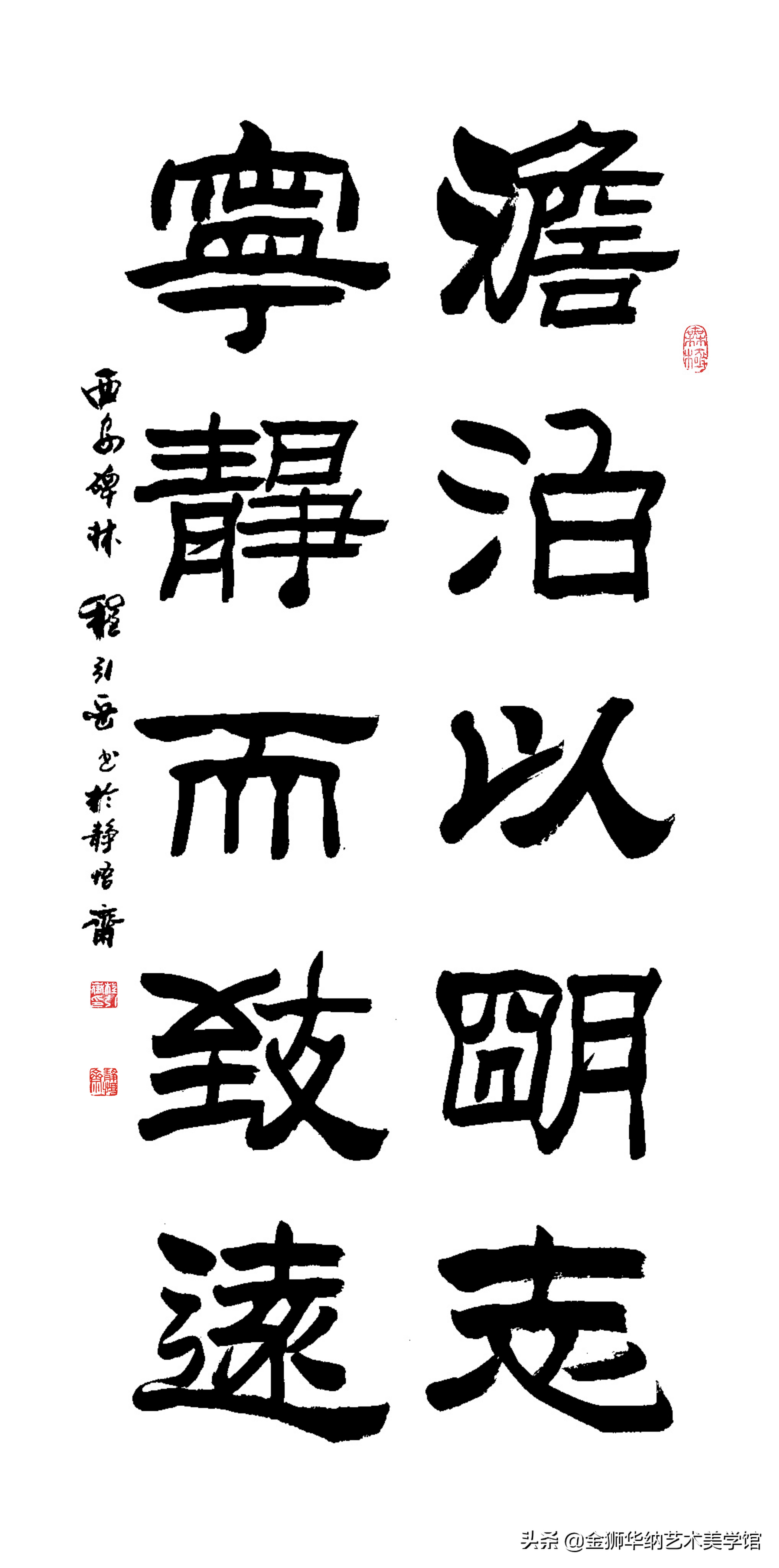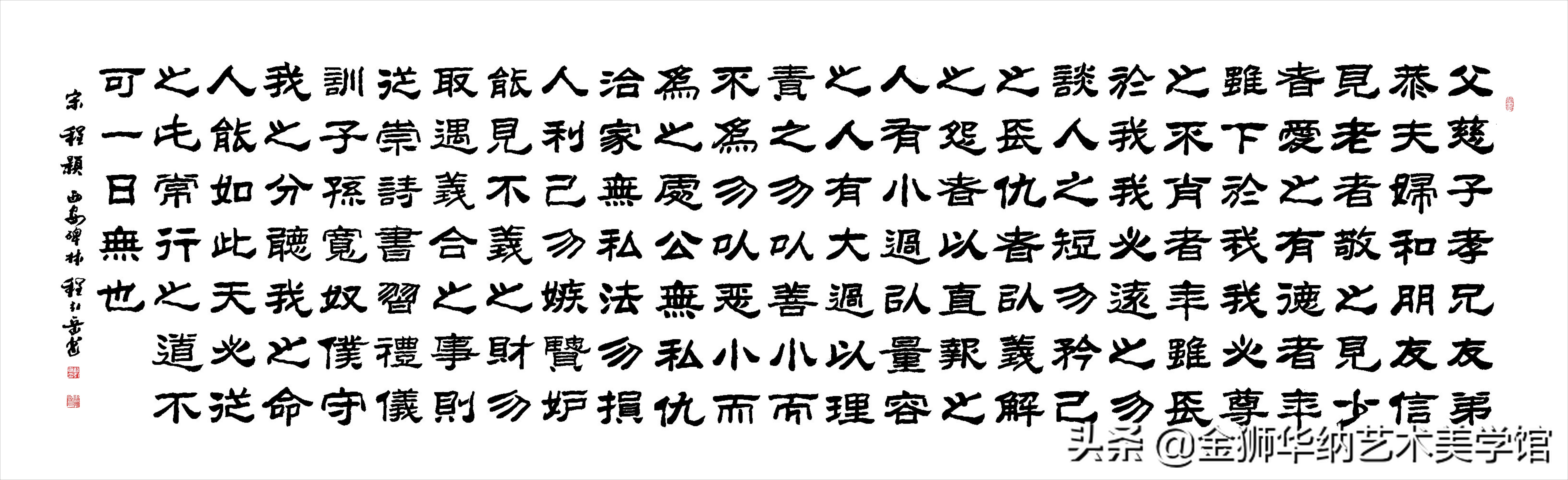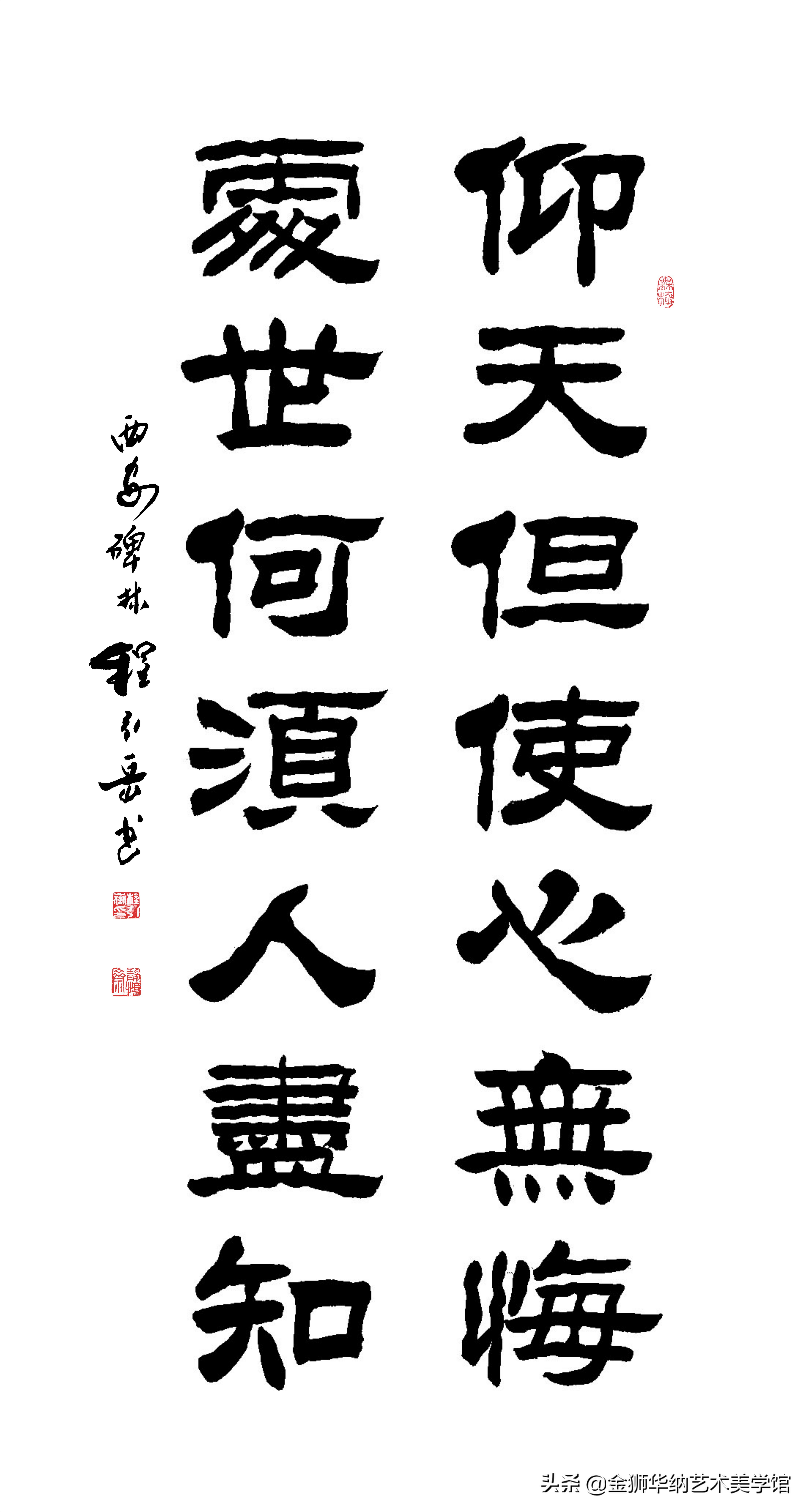 程引岳先生的榜书艺术融汇了颜体,柳体等百家之长,体兼众美,他推陈出新,顺应时代书法艺术发展的新趋势和新特点,赋予了榜书字体新内涵,开拓了书法的表现力,是中国书法艺术走向成熟的一个显著的标志,是榜书大字重新登上大雅之堂的抗鼎力作。