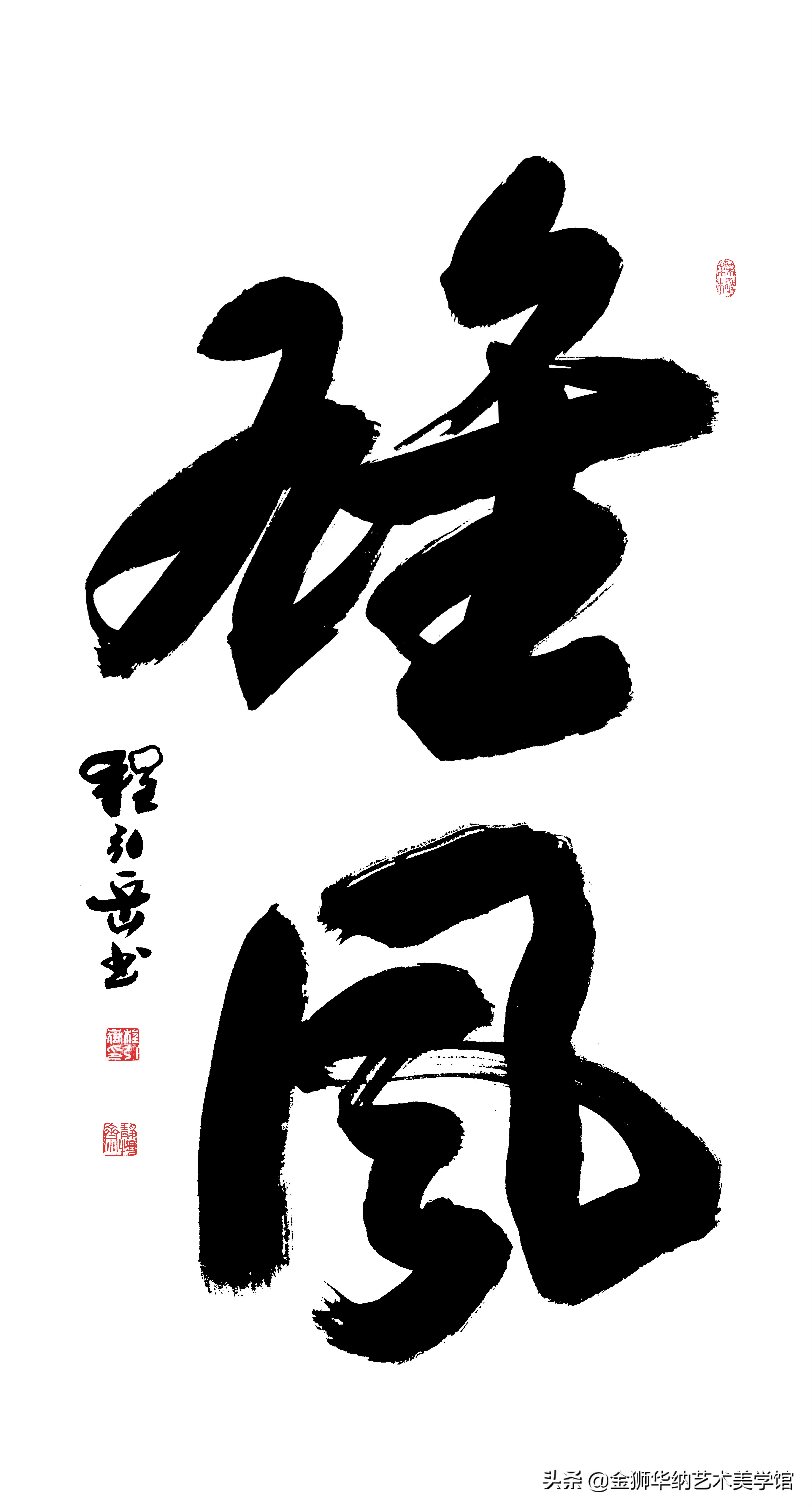 独具雄美的“程体榜书”,高古苍劲,厚重端庄,大气磅礴,有很强的艺术震撼力,字里行间横溢着粲然忠义之气。有学者称:他的字里充满正气、虎气、英雄气和圆融富贵之气。特别是用这种字体写的招牌,更加事半功倍,有画龙点睛的作用。