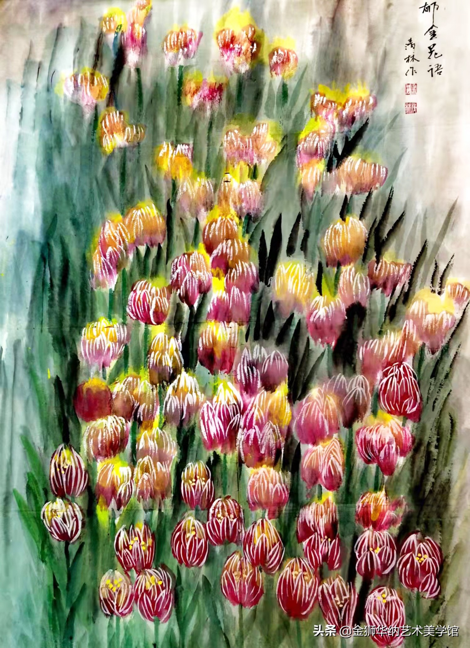 作品源于山间的野花野草,隐约可见旷野中流动的清新空气。画面层次感明显,花卉艳而不俗,不媚。这正是他对原生态生命的一种追求和向往,对真理和真善美的一种执着热爱。从作品中可见笔下的花草具有顽强的生命力,足见他内心深处对生命真谛的一种呐喊和宣泄。
