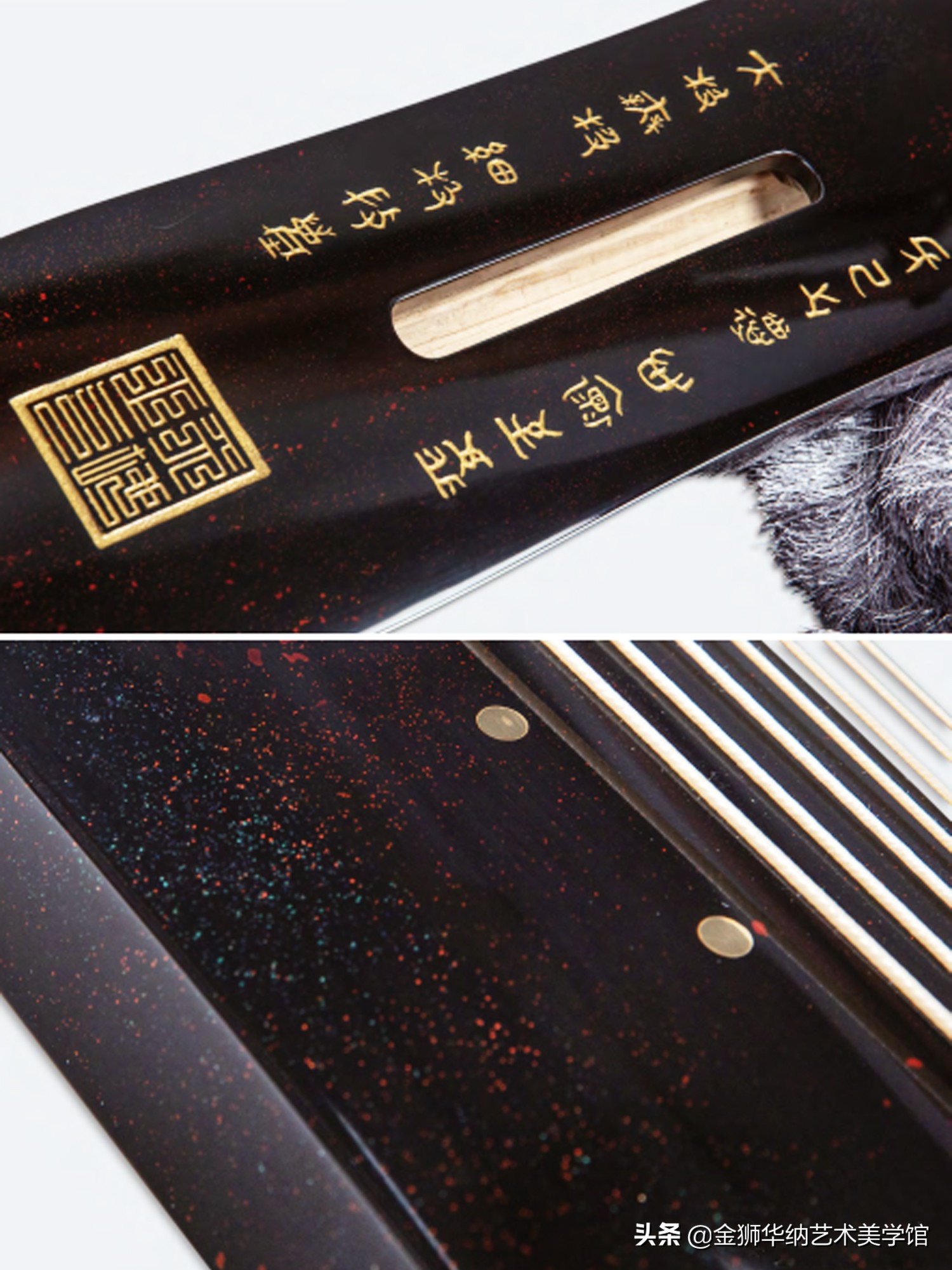 剑式“无极”琴之美,即来自造型上的昂扬劲健,也来自高妙髹漆工艺带来的沁润自然、古朴典雅。此琴的髹漆工艺出自著名漆器修复专家、故宫博物院研究馆员闵俊嵘先生之手。感念剑式琴“琴剑合一”的精神内涵,闵俊嵘先生在具体的制作中,在灰漆中加入了适量的八宝灰,并使用较厚的灰漆层对胎体振动进行抑制,从而使琴色达成了温润清冽的风格。此外,闵俊嵘先生在琴体表面控制了八宝灰的磨显,退光以后揩漆出光后,呈现出独特的艺术效果。抚琴而观,可见沁润光亮的黑色漆面上,朱漆点点,既如繁星当空,浩若寰宇,又似残阳如血,豪气干云。