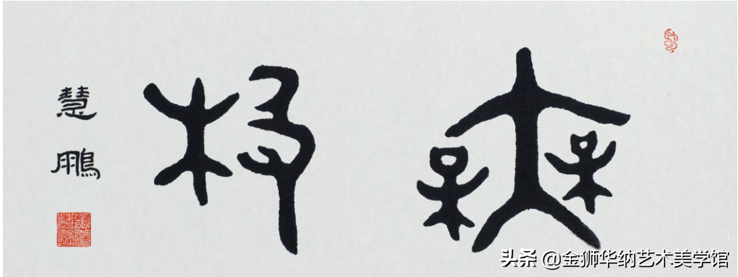 朱慧鹏为书,以四大书体中最为玄奥难学的大篆为体。为此,朱慧鹏一方面投身书海,大量阅读史料、临摹碑刻;另一方面,他广泛求学名师,在前辈的教导和书迹中,窥寻书写大篆的正途。从他的书作可见,其书法延续晚清、民国至今的李瑞清(清道人)、胡小石、张隆延、罗建武一脉。在创作中,从金文入手,取法散氏盘、毛公鼎。作品浑厚含蓄,结体错落,笔态自然,神韵多变。可谓天趣横生,耐人寻味。