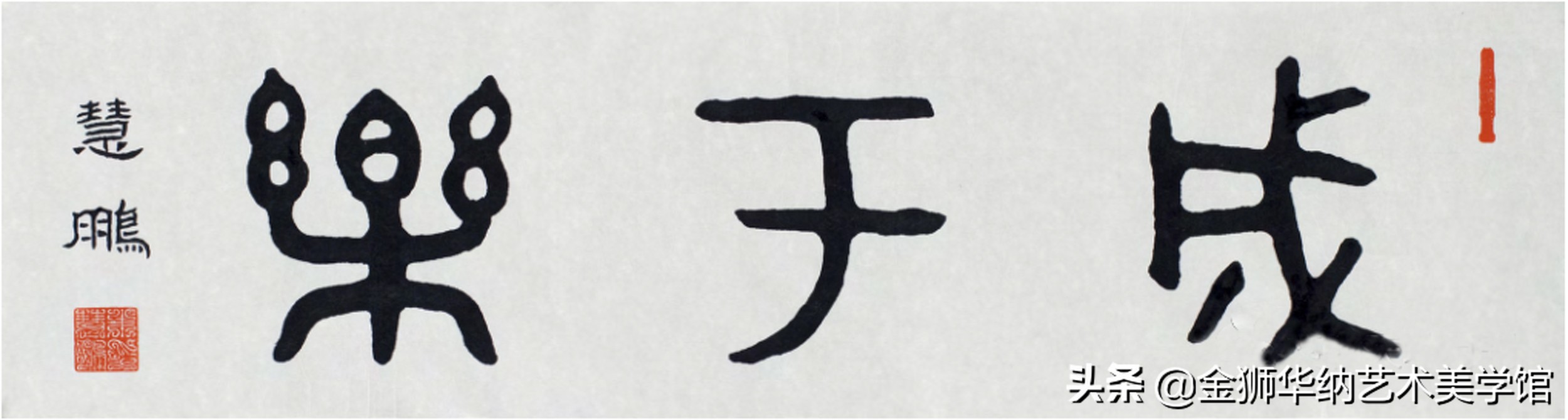 书法的核心价值是文字符号化后面的信息价值,是实用性与艺术性的统一。因此,书写内容对书法的文化价值和审美价值具有极其重要的作用,为了展现当代琴人对琴文化的思考与理解。朱慧鹏有目的地选择了与琴文化相关的语句,作为自己大篆书法的书写内容,比如,他的篆书作品《成于乐》,取用《论语·泰伯》“兴于诗、立于礼,成于乐。”之句。以书法的方式,表现了琴人对音乐教化功能的尊崇,对美德的向往。欣赏此作,有若静听琴德佳音,足可修养性情、感德知美。