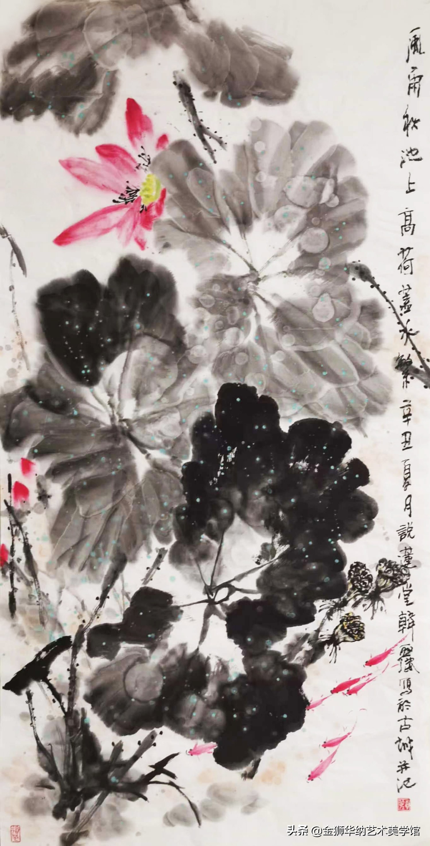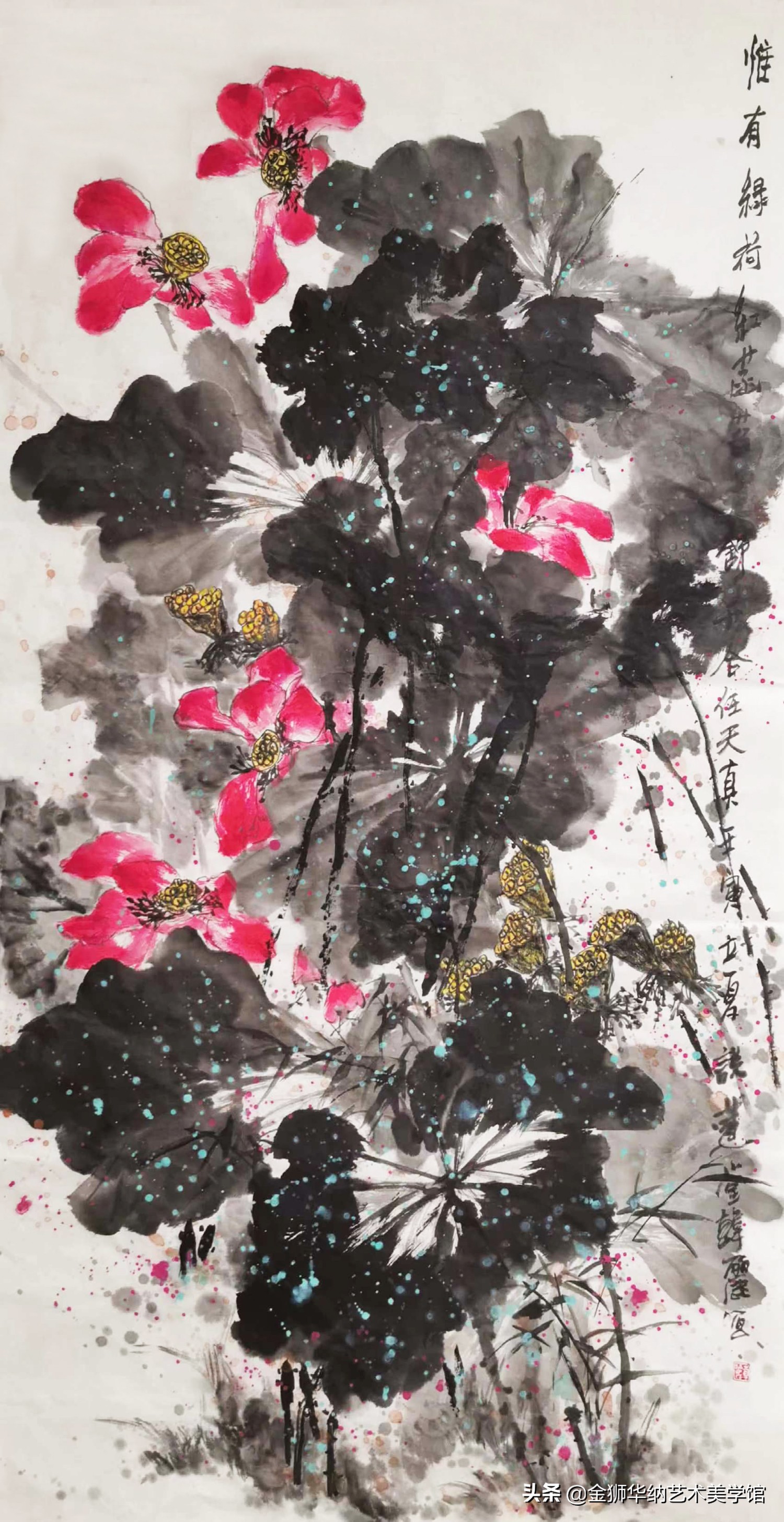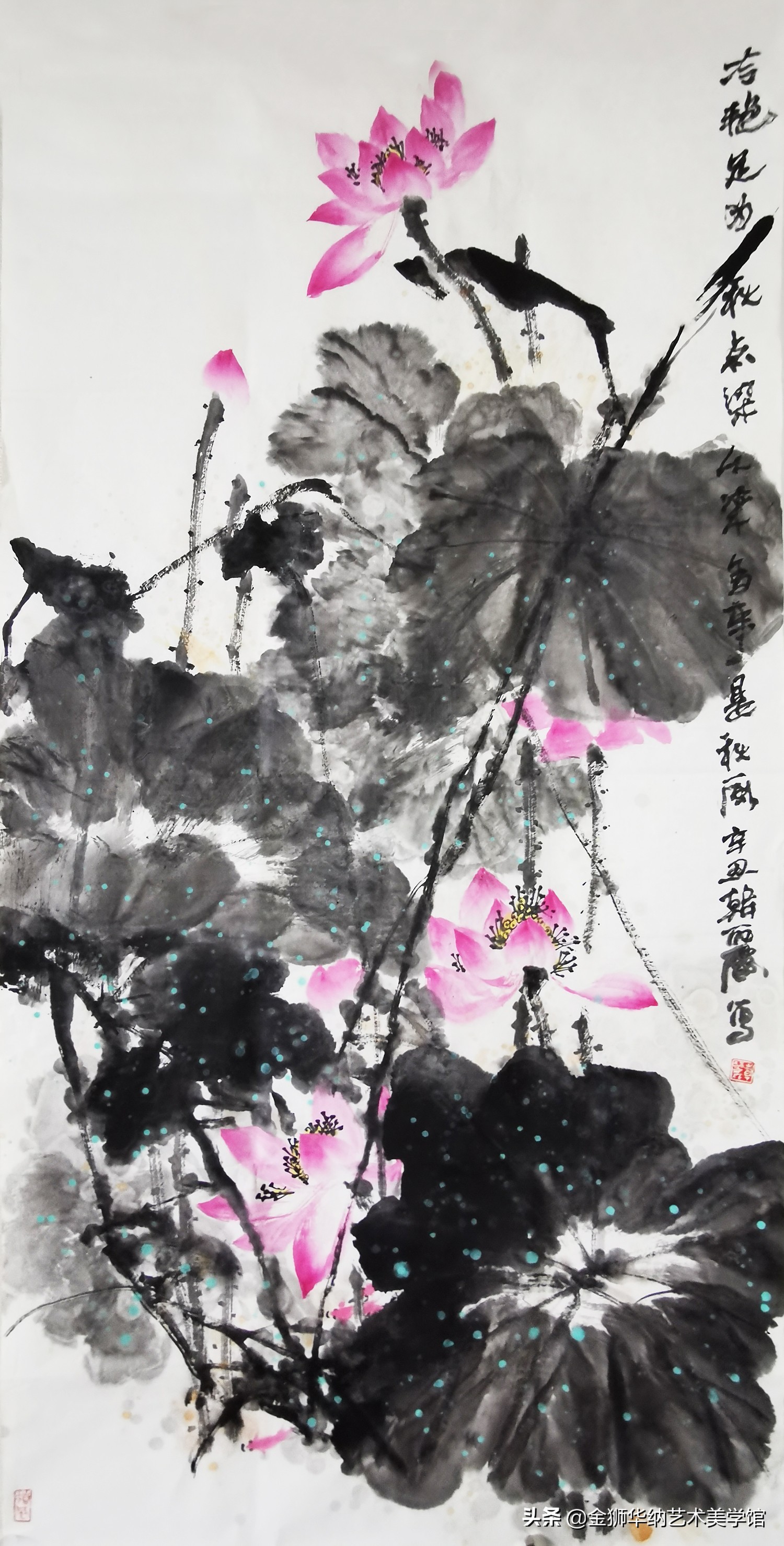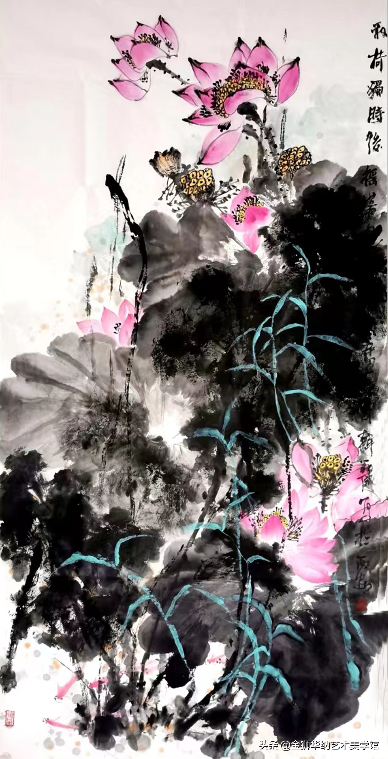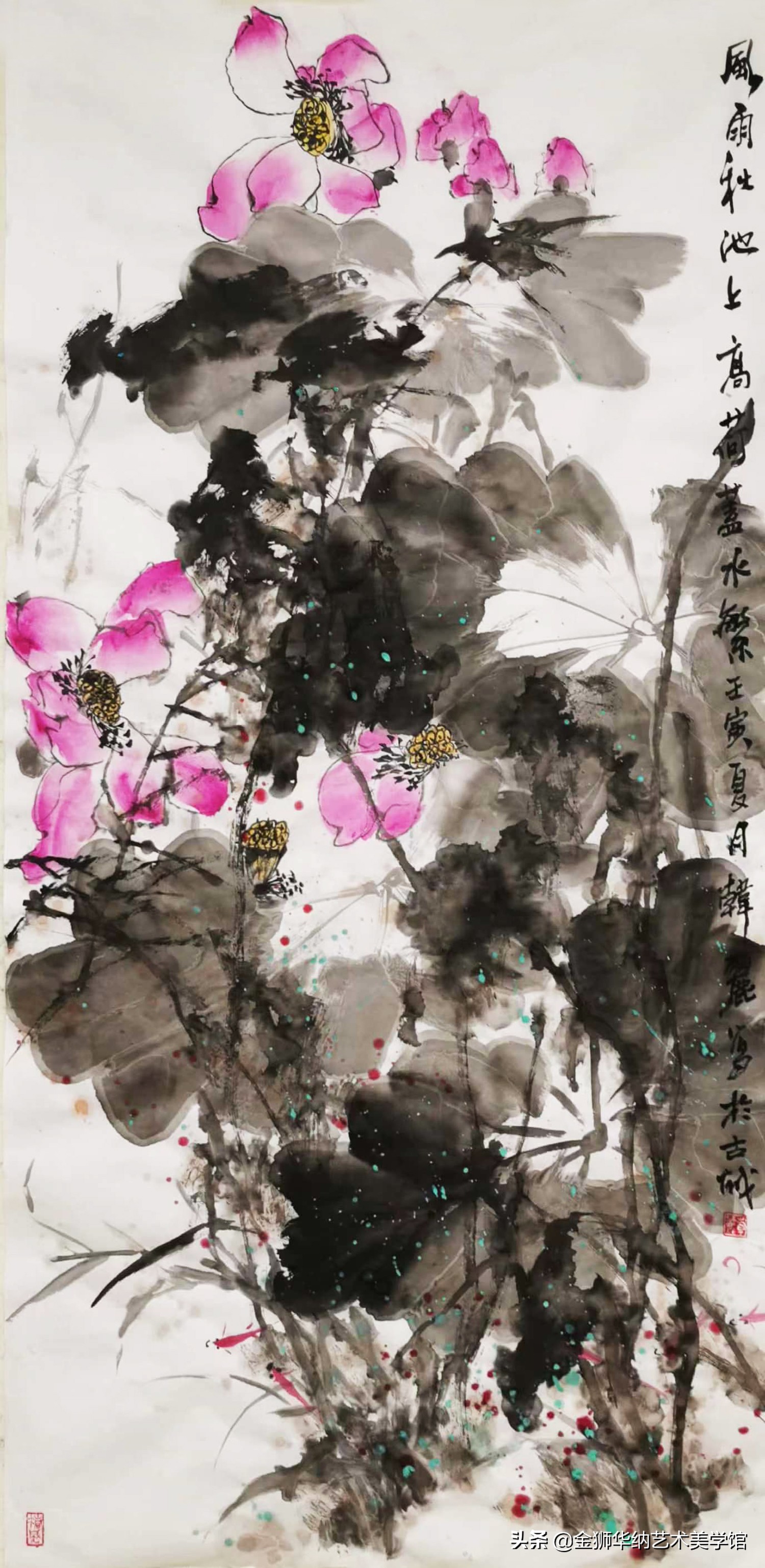 一支饱蘸浓墨的大笔洒向宣纸,画成浑厚荷叶,在斑驳的墨色中,让观者体会着生活的酸甜苦辣。不经意的几笔皴擦点染了一塘池水,清澈荡漾,无私无欲,洁净的使人流连忘返。秀一笔淡淡曙红描绘的荷花,让它高洁的志向,在不经意间飘向远方去净化大众的心灵。