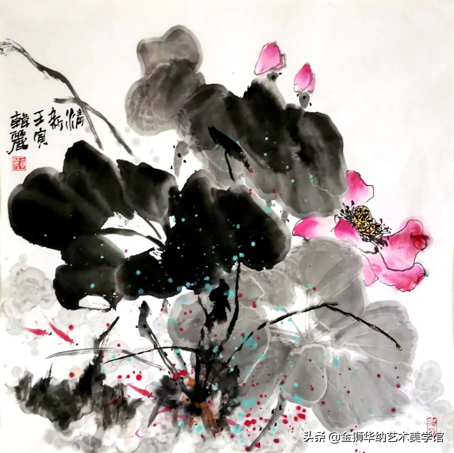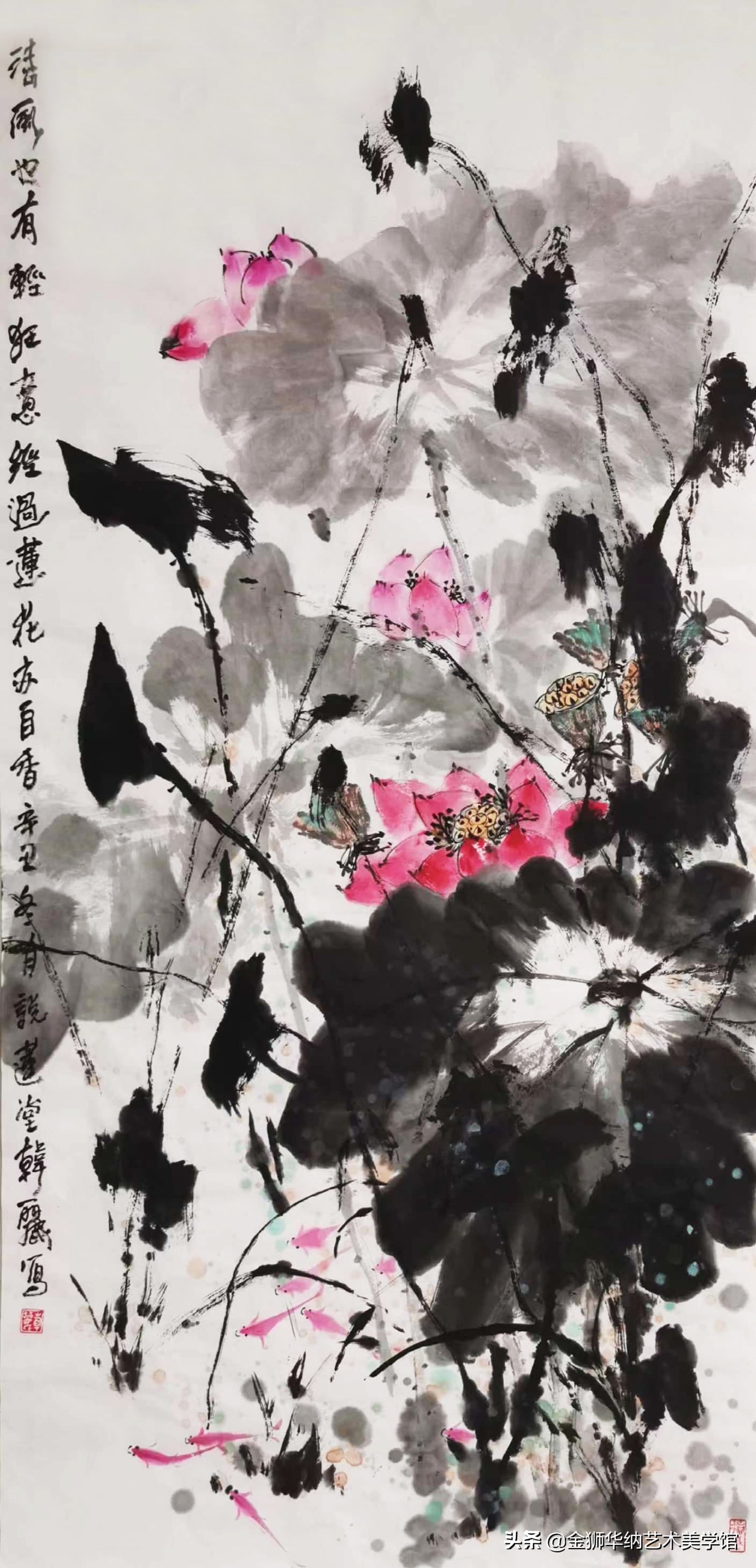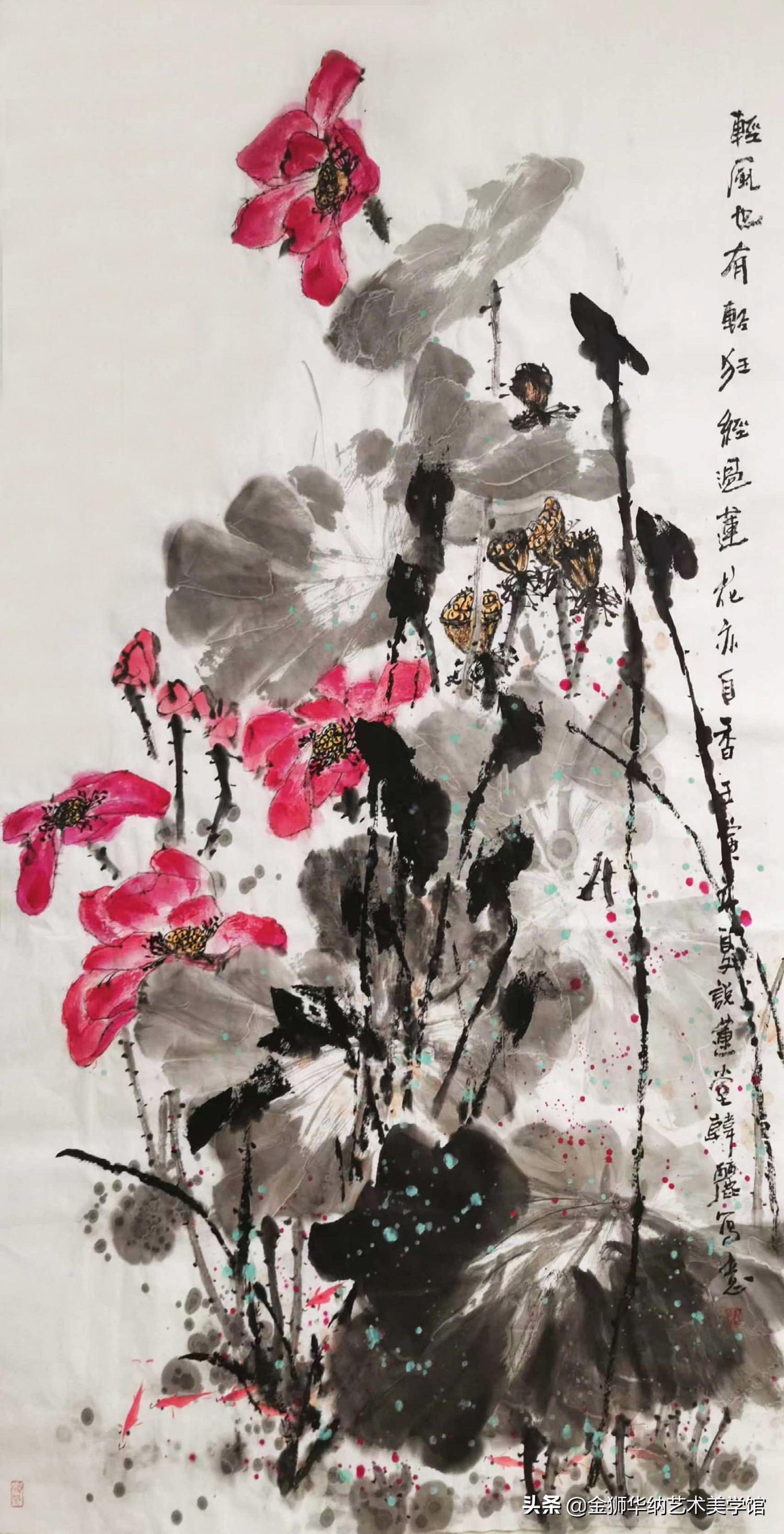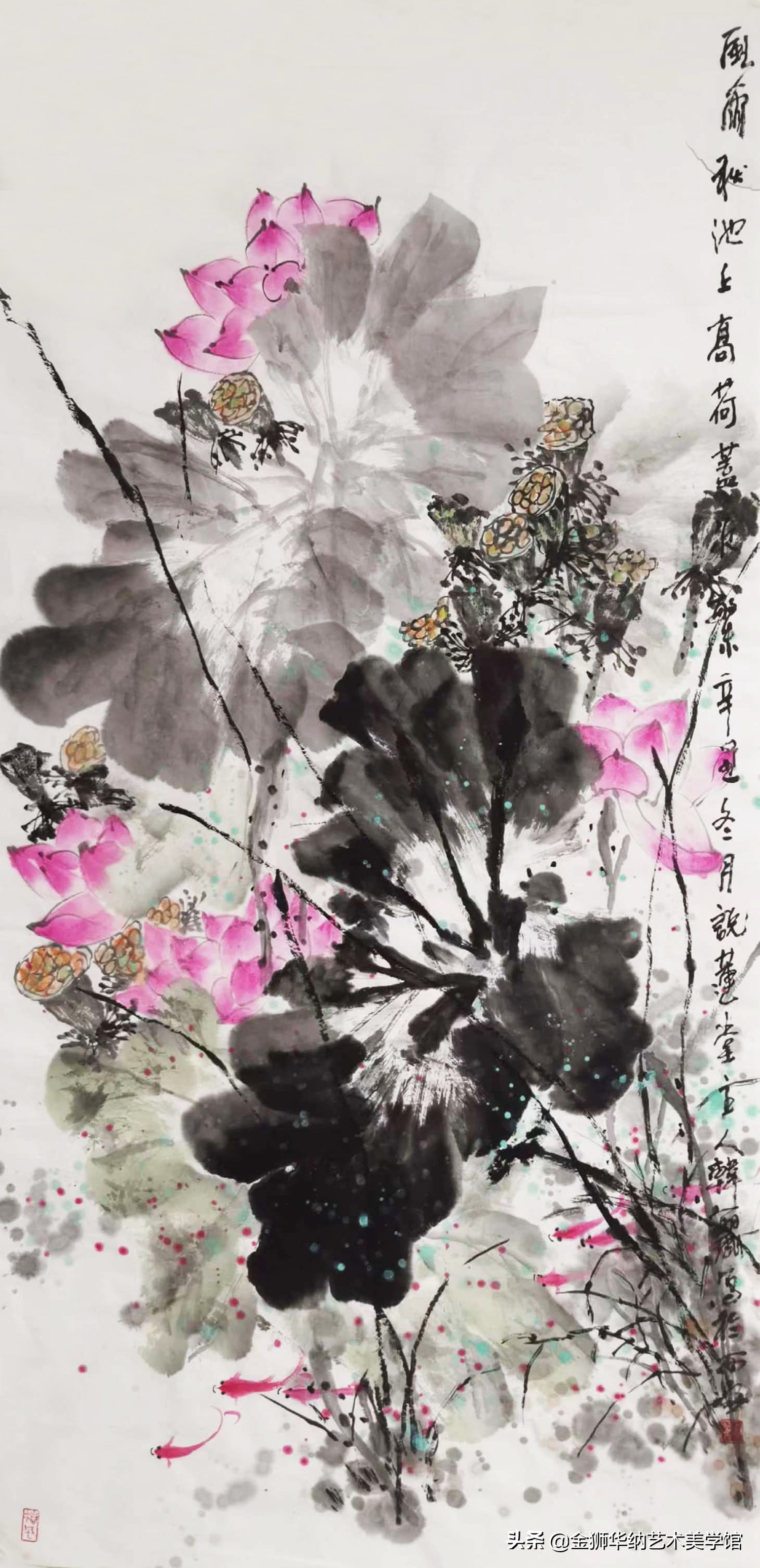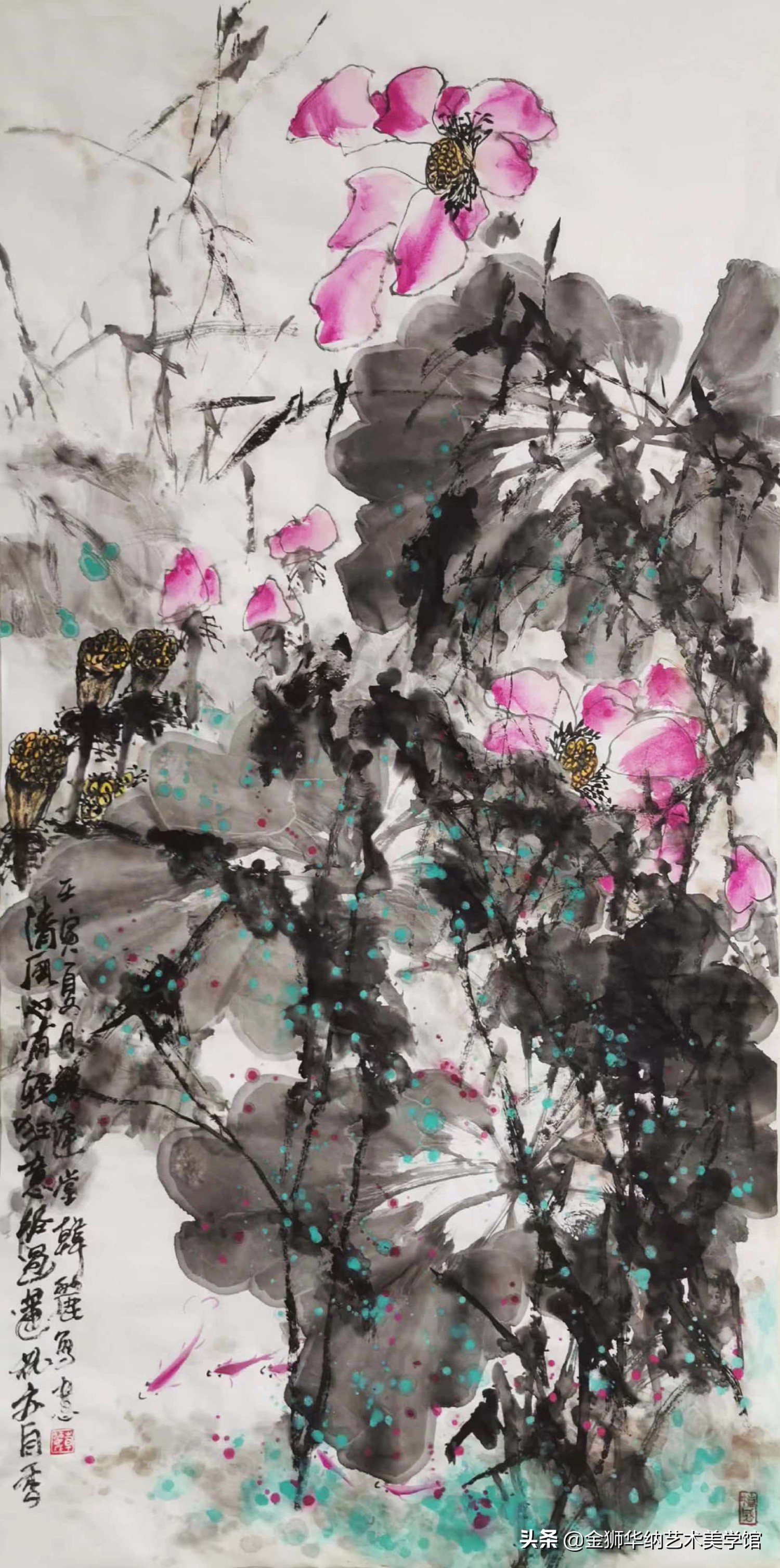 一支饱蘸浓墨的大笔洒向宣纸,画成浑厚荷叶,在斑驳的墨色中,让观者体会着生活的酸甜苦辣。不经意的几笔皴擦点染了一塘池水,清澈荡漾,无私无欲,洁净的使人流连忘返。秀一笔淡淡曙红描绘的荷花,让它高洁的志向,在不经意间飘向远方去净化大众的心灵。
