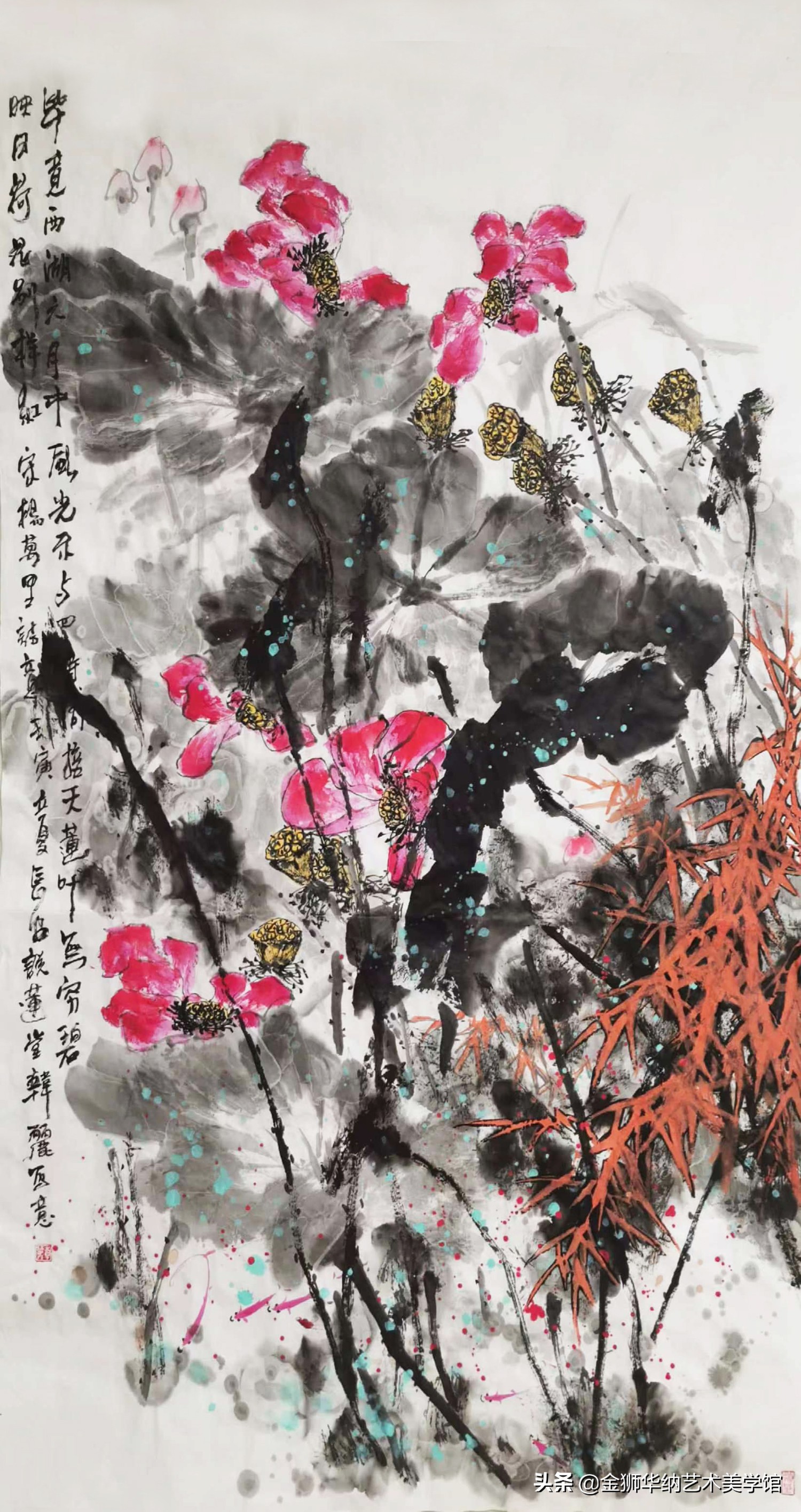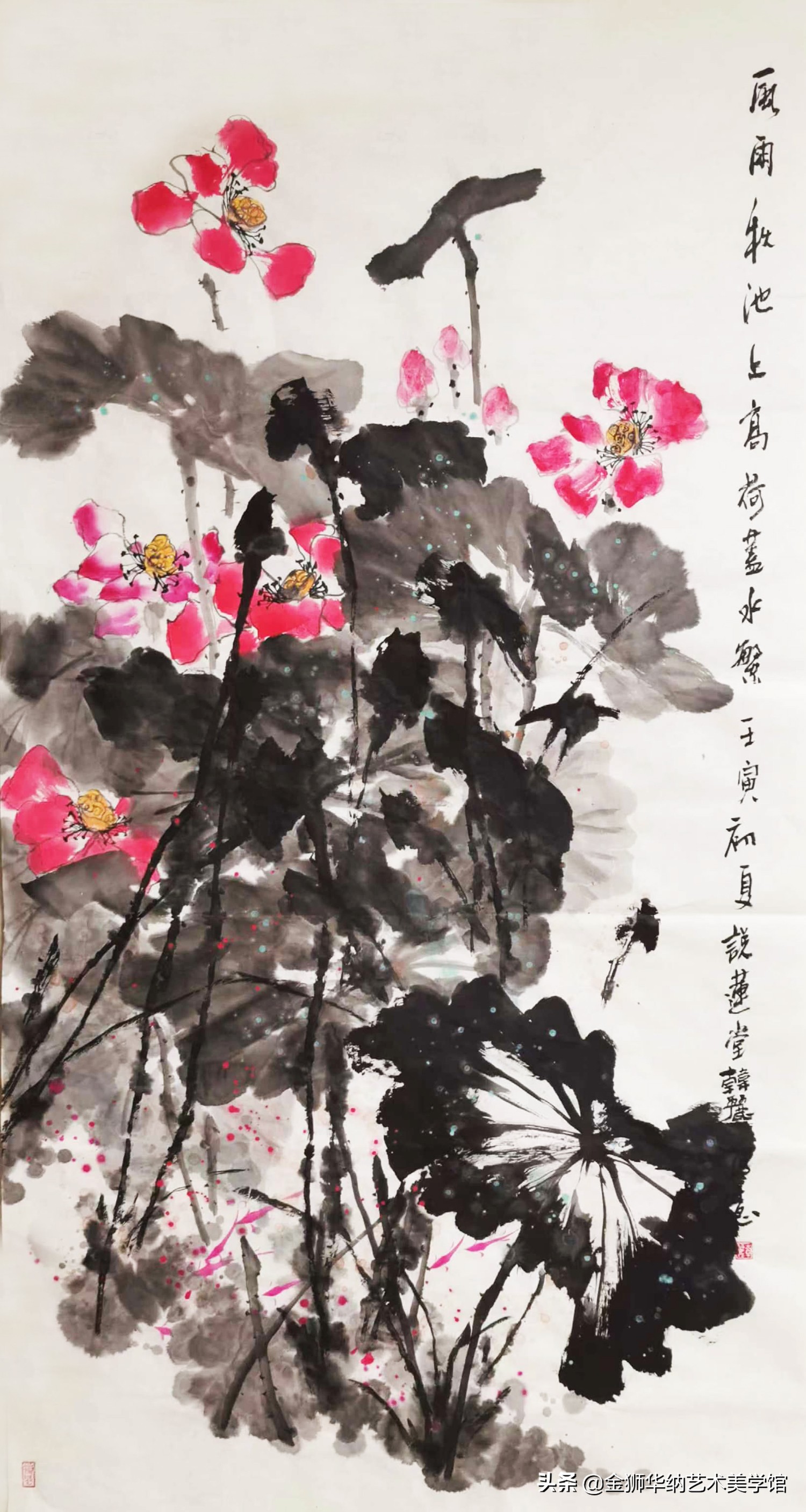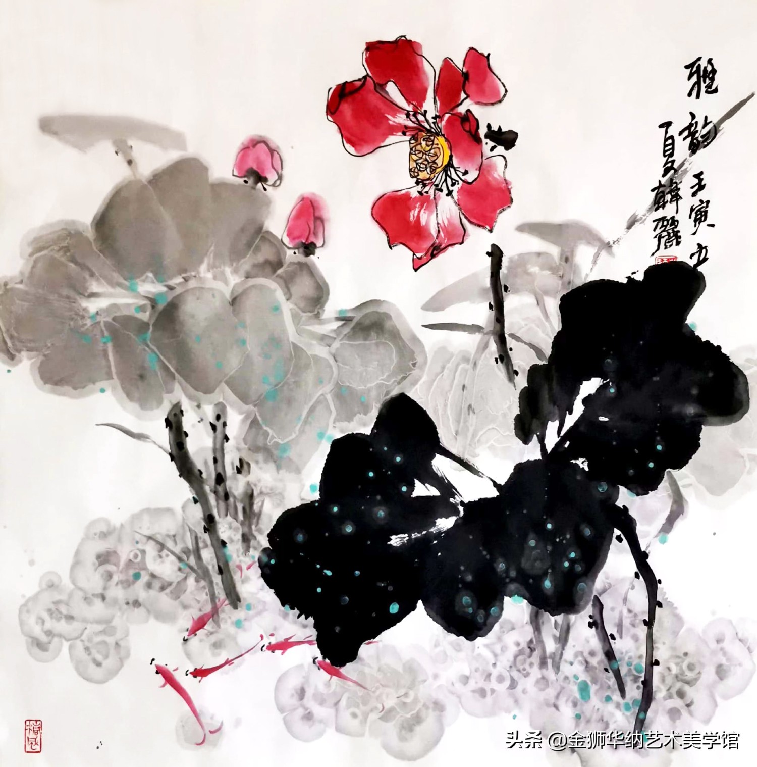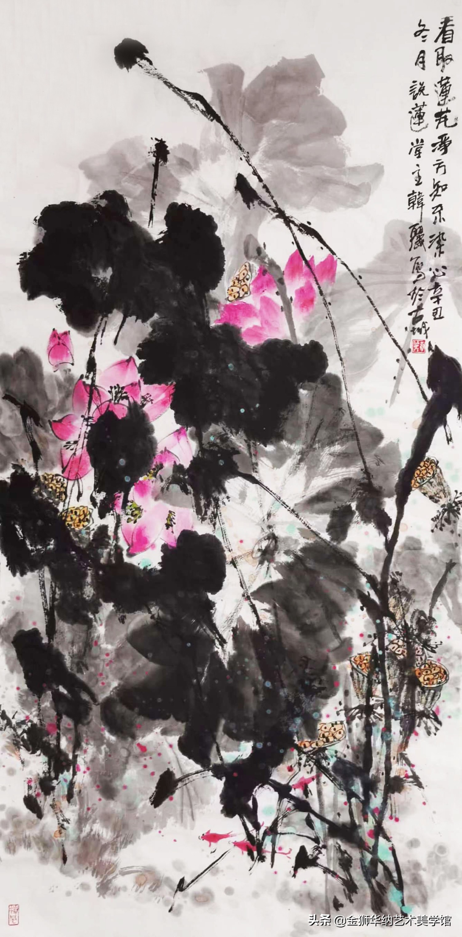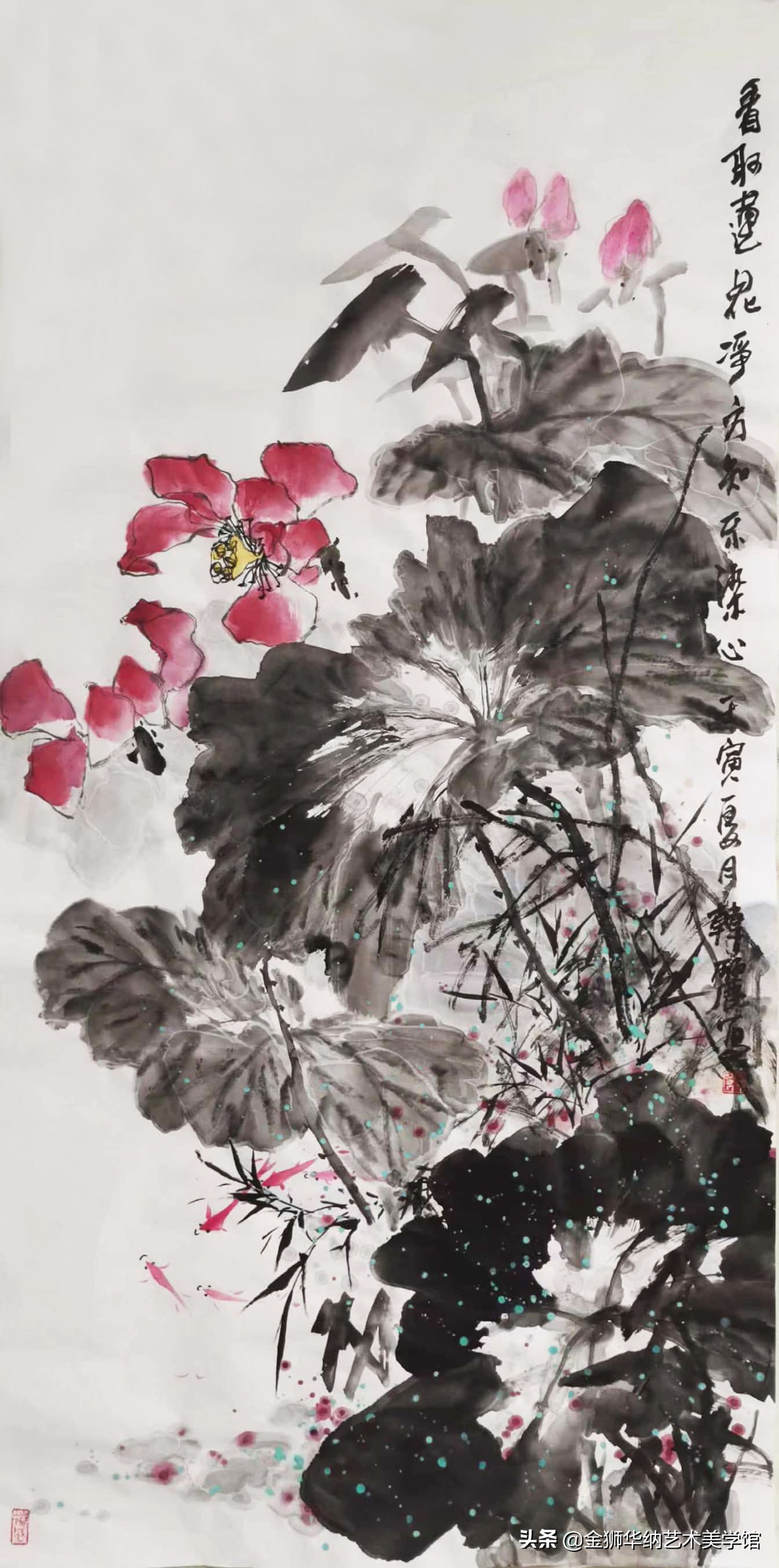 一支饱蘸浓墨的大笔洒向宣纸,画成浑厚荷叶,在斑驳的墨色中,让观者体会着生活的酸甜苦辣。不经意的几笔皴擦点染了一塘池水,清澈荡漾,无私无欲,洁净的使人流连忘返。秀一笔淡淡曙红描绘的荷花,让它高洁的志向,在不经意间飘向远方去净化大众的心灵。