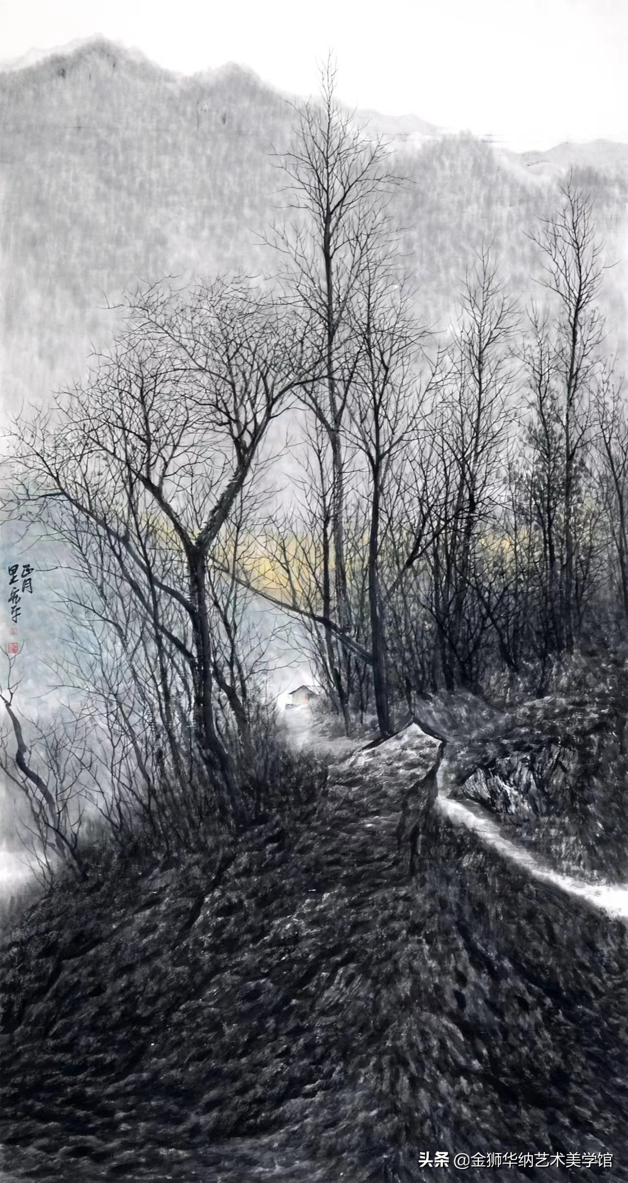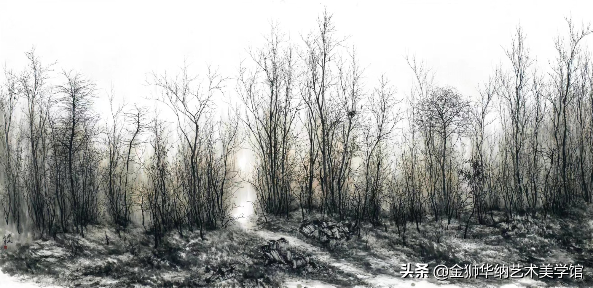 寒林是我每次在冬季看到的:在夕阳余晖一片橙灰的背景下,在晨曦一片白净如玉的背景下,或夜晚一片幽蓝天空的背景下,山林的剪影静穆,或如哨兵挺直耸立,或如少女婀娜多姿,一簇簇、一排排,或依偎,或交融,它们高低错落有致,穿插疏密有韵,粗细配搭有节,直曲造型有律,非人工所能及!我提取这些艺术语言,有效组织画面,追求逆光效果,得到画面宁静和生命的美感。