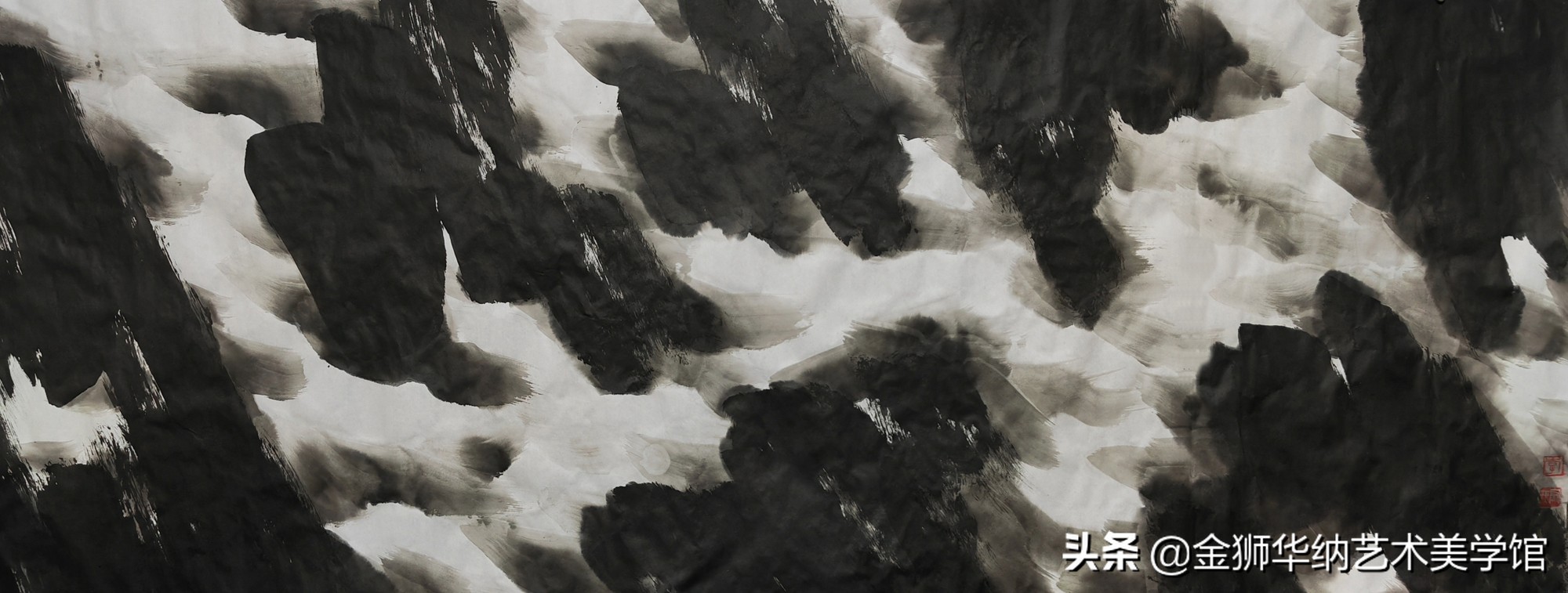 墨玉青山系列是我从夏日的大巴山提取出来的艺术语言,大巴山很多山上没有高大的树木,而且藤蔓缠身,夏日就形成了一团团一簇簇球形状的植被覆盖,满山遍野,有如绿玉,为了画出这种感觉,我实验了很多方法,最后得出需要用秃笔沾宿墨在加厚宣纸上制造肌理反复渲染三五遍后才能达到黑而不死,黑而通透,黑而润泽的艺术效果。