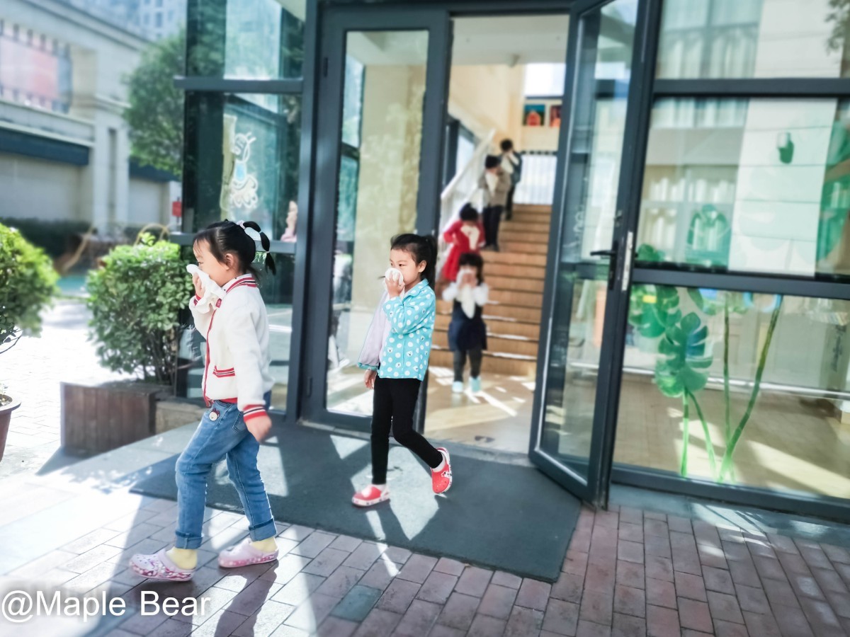 防诱拐演习结束后,小朋友陆续被老师带回教室,正常的开展室内活动。约半个小时后,刺耳的警报声响起,原来是火灾紧急疏散的警报声,老师和孩子们丝毫不敢怠慢,生活老师急忙将班里的小毛巾打湿,分发给每个小朋友,小朋友弯腰捂鼻,顺着墙壁避过“浓烟”,摸索着快速前行,下楼梯时小手扶着楼梯,一路相随,在老师的看护下,顺利撤到宽阔的操场。