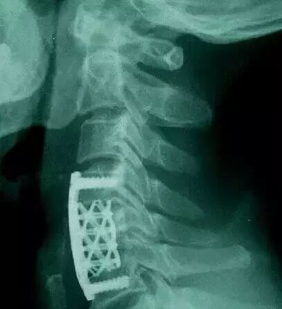 ▲植入人体的钛网拍片效果图。这个钛网取代了患者的两节颈椎骨。医生为了让钛网固定,还在外面用一片钛网做了个「围栏」把支撑的钛网包了起来,防止起支撑作用的钛网移位。