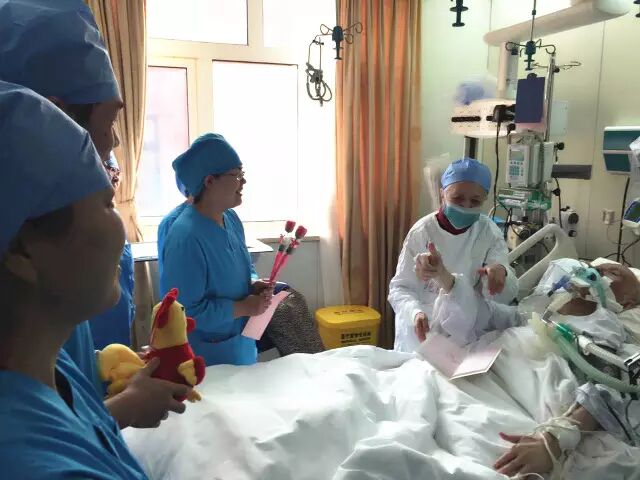 老人因为气管插管不能说话,有一天,在纸上颤颤巍巍的写下了“金婚”二字。了解到老人的情况,为了安抚老人,满足这对金婚夫妇的愿望,1月17日这天,病房的医护人员特地把徐先生的老伴和子女请到病房床边,并献上金婚的贺卡和代表爱情的玫瑰,为这对金婚伉俪合影留念。