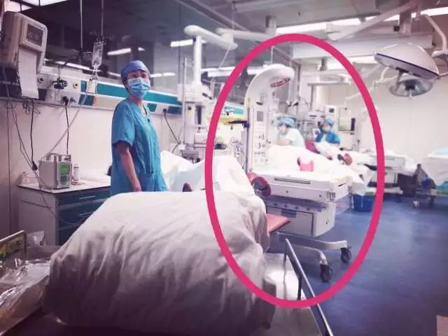 回到产房,这里已经准备好了辐射台。我们迅速把孩子放在辐射台上(辐射台上的温度是32-34度,处理新生儿的标准环境。新生儿复苏中保温这一步至关重要)。