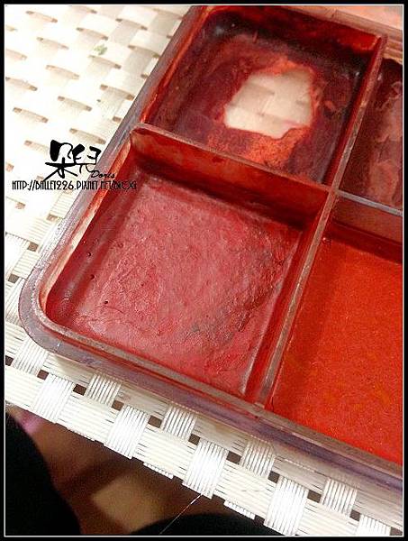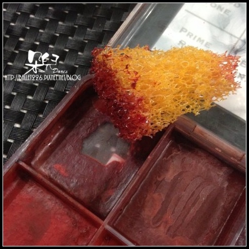 用質感海綿沾紅色酒精色盤顏料點壓在嘴巴周圍!