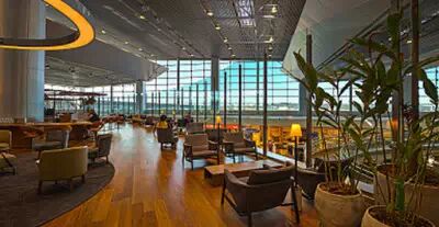 贵宾休息室位于机场安检和移民检查以内的候机区,位于9号登机口对面的楼上,可按标识指示乘电梯或走楼梯到达此层。该贵宾休息室提供130多个座椅。每周7天,全天24小时开放。