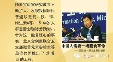 4、2004年10月12日卫生部副部长王陇德在国务院新闻发布会上向全世界公布了《中国人群的膳食与营养状况调查》结果。并发行了《中国人群的膳食与营养状况调查》一书,书中首页王陇德副部长作了“中国人需要一场膳食革命” 的重要提词,且明确指出“控制慢性病已成为我国当前卫生工作的当务之急”。