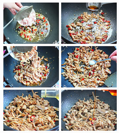 下五花肉煸炒至熟。烹入黄酒。下入鸭肠。调入盐、味精、白糖。烹入花椒油。烹入辣椒油。