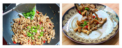 最后下入辣椒煸炒入味。烧好的鸭肠盛盘即可享用。