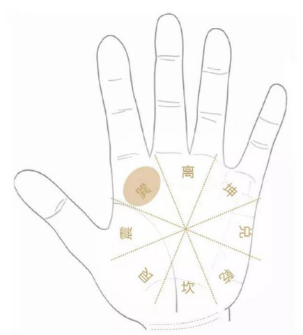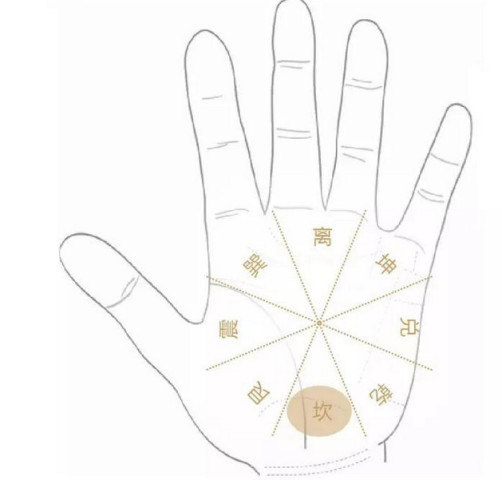 掌根对应坎卦,正北。反应在家庭风水上,常见正北是厕所,或者马路,或者广场。