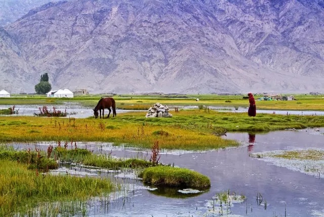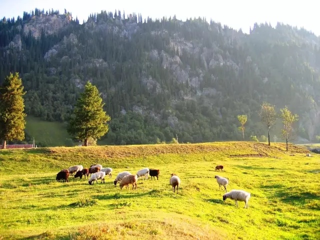 26/29这里水草丰美,牛羊遍地,和远处的雪山白云蓝天交融在一起十分漂亮。等到夕阳西下,碧绿的草滩一片金色,远处牧人白色的毡房,羊群都沐浴在夕阳下,这就是阿拉尔金草滩。