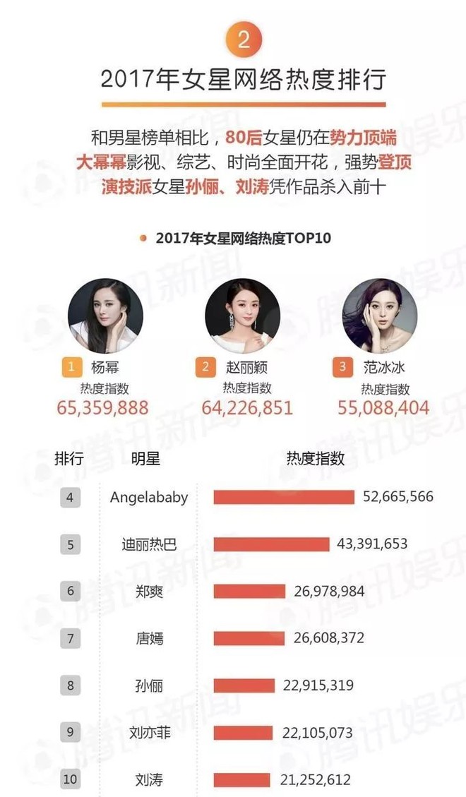 在《2017腾讯娱乐白皮书》的女星商业价值、时尚指数、公益影响力榜单上,杨幂均挺进前三;而在2017年女星网络热度排行榜及腾讯新闻网友之选十大流量女星榜单上,她更是获得“双冠军”;在2017女星“网络热度”、“时尚指数”、“商业价值”、“公益影响力”、“十大流量电视剧演员”、“综艺明星”等十个盘点中均榜上有名。