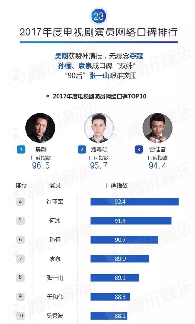 而事情的另一面则是,《人民的名义》以平均收视率3.661、单集最高收视破7的傲人成绩成为当之无愧的年度剧王。在剧中扮演达康书记的吴刚也成为现象级偶像。“守护达康书记GDP”的热门话题瞬间刷频社交媒体。吴刚也凭借口碑和人气认证,获得“电视剧年度之星”。