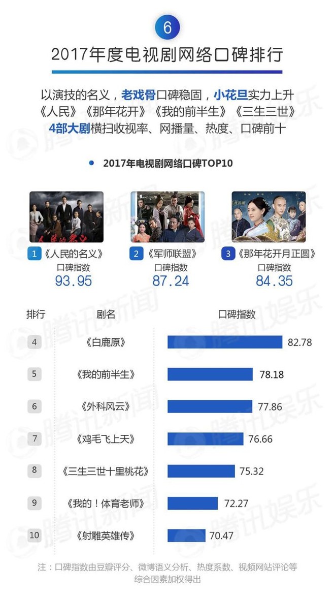 现在来看,2017年是国产剧的大年,也是洗牌之年。根据腾讯娱乐白皮书的数据,2017年收视破1的22部国剧中,IP改编剧占据7部。但令人尴尬的是,这些跻身网络热度排行的IP剧,在网络口碑排行上全军覆没。