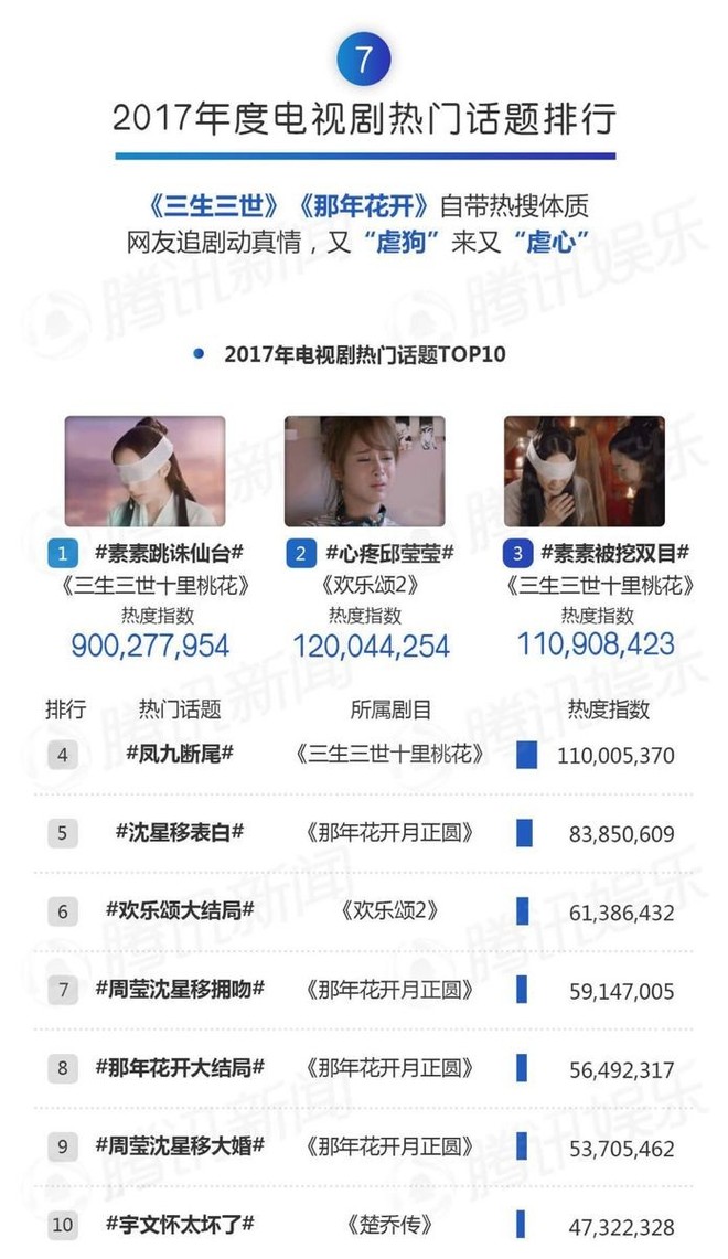 《三生三世十里桃花》以播出期间网络播放量突破300亿、总播放量430.92亿的成绩证明了嘉行的制作能力,在腾讯娱乐白皮书中一举闯入“电视剧收视率”、“网络播放量”、“网络热度”、“网络口碑”、“热门话题”、“角色热度”、“十大流量电视剧”、“影视歌曲热度”、“全民K歌歌曲点唱次数”等诸多榜单,真实展现了一部热播剧从年初火到年尾的爆款实力。