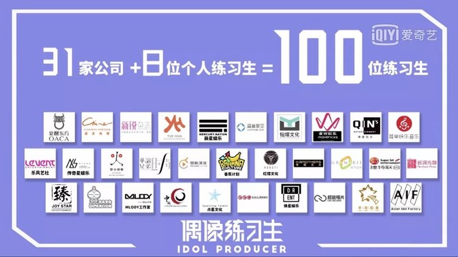 就像甄嬛传的秀女分汉军旗、满军旗一样,《偶像练习生》的成员构成也相对复杂:先从87家公司的1908位练习生中筛选出100位练习生,这其中除了8位个人练习生,其余的92名练习生分别来自31家经纪公司,其中包括国内最早体系化培养练习生的乐华娱乐、王思聪旗下公司香蕉计划、《康熙来了》制作公司野火娱乐以及华谊、英皇等知名经纪公司。