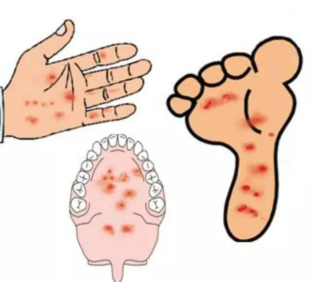 发热、食欲不振,2天后手心、脚心、口腔内出现皮疹或疱疹,即小红点,其他部位也可能出现皮疹。