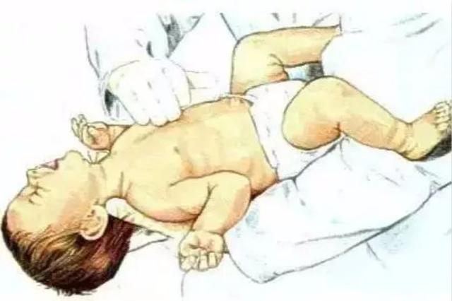 5、依次重复5次背部拍击和5次胸部冲击,直到异物排出或是婴儿失去意识为止。
