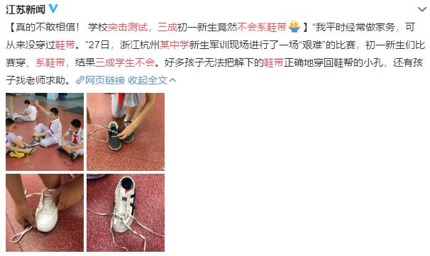 近期,杭州市采荷中的老师们在初一新生军训间隙,给他们准备了这样一个有趣的比赛——穿、系鞋带及叠衣服劳动比赛。