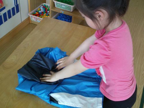 而叠衣服能够考验学生的观察力和细心程度,一些学生在叠衣服时,完全没有模仿模板,而一些学生会跑到模板衣服前仔细观察,叠完后又反复对照。