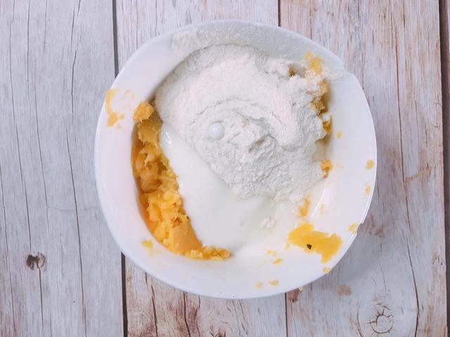3.把酸奶和适量面粉倒入到蒸好的南瓜里面,一起用勺子搅拌均匀。