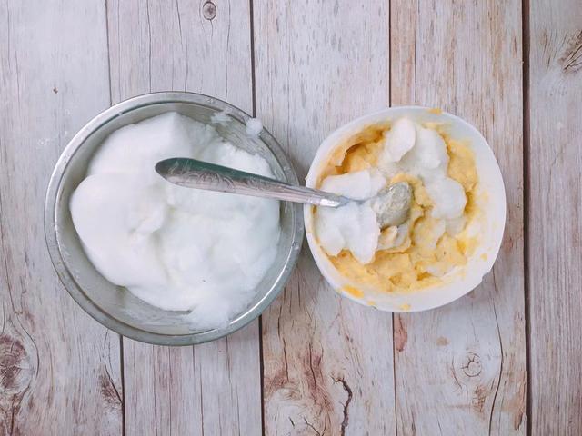4.用刮刀刮取三分之一的蛋白霜放到南瓜泥里面,用刮刀切拌均匀。然后再将山药泥一起都倒入到剩下的蛋白霜中,继续用刮刀切拌均匀。
