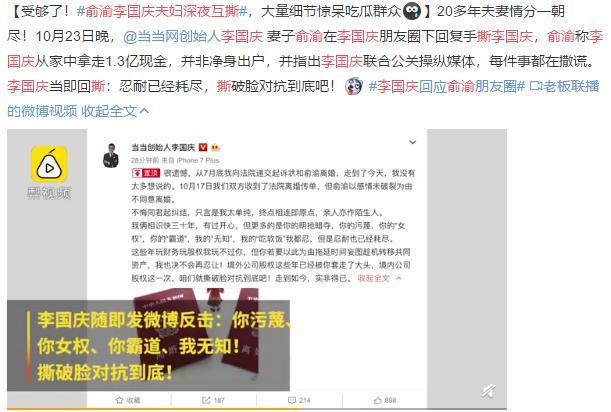 但在昨天深夜,当当现任董事长俞渝在朋友圈开撕丈夫李国庆,直指其同性恋、撒谎、不顾家,且患有梅毒等内容。10月24日凌晨,李国庆再次发布微博回应俞渝的朋友圈爆料,"请不要仅仅把你描绘成婚姻受害者。不想揭露你伪善嘴脸,爱过请珍惜"。
