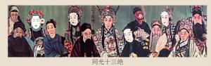 http://pic.baike.soso.com/ugc/baikepic2/47683/20160713201352-334988667.jpg/300同光十三绝《同光名伶十三绝》是京剧史上的一幅名伶彩色剧装写真画,由晚清民间画师沈蓉圃绘制。他参照了清代中叶画师贺世魁所绘《京腔十三绝》戏曲人物画的形式,挑选了清同治、光绪年间(1860至1890)京剧舞台上享有盛名的十三位演员(程长庚、卢胜奎、张胜奎、杨月楼、谭鑫培、徐小香、梅巧玲、时小福、余紫云、朱莲芬、郝兰田、刘赶三、杨鸣玉),用工笔重彩把他们扮演的剧中人物描绘出来,显示了作者的深厚功力。此画于民国三十二年(1943年),由进化社朱复昌在书肆收购,经缩小影印问世,并附编《同光名伶十三绝传》一册。[3]