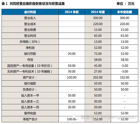 假设共同经营后续阶段财务状况与经营成果如表1所示: