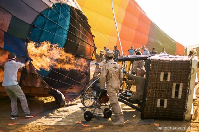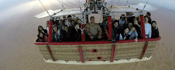 沙漠里的风,混着火苗和沙土味。我睁着朦胧的睡眼,和来自世界各地的旅人们,一起爬进能装下25人的篮子。听完Captain的安全培训,绳子嘣地一下子断开了,气球就这么摇摇晃晃离开了地面,那一刻心里有忐忑,但只好听天由命了。
