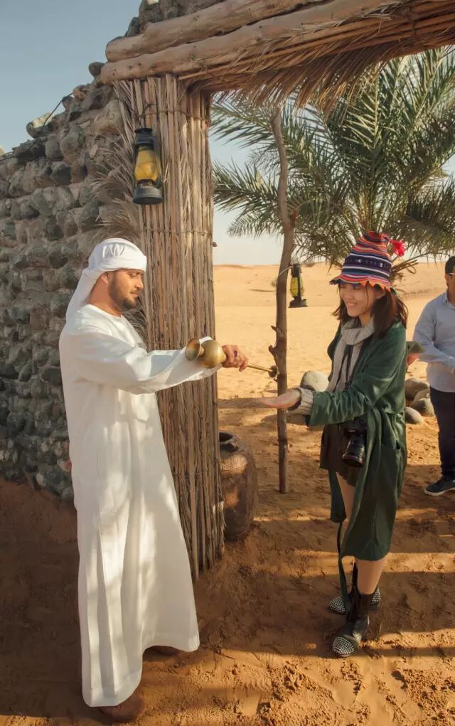在一座像沙漠里的城堡前下车,这里叫Al Maha Resort,一进门就有人用阿拉伯神灯形状的咖啡壶,给每个人倒水洗手。