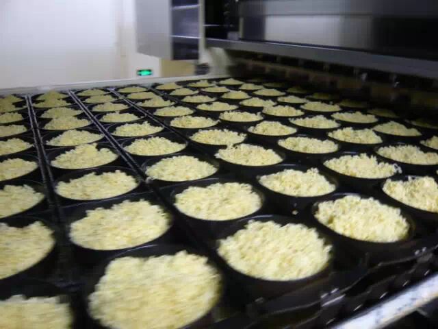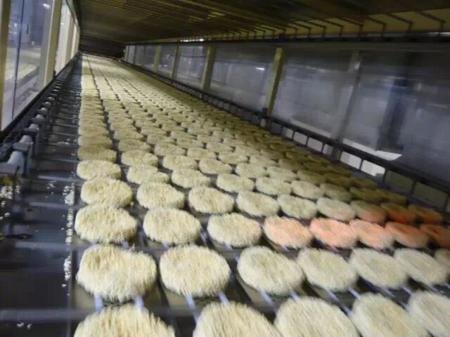蒸完之后就进入了令大家比较敏感的炸制过程。其实方便面的油炸是低温快速油炸(油温130度左右,油炸时间110秒左右),目的是为了脱除水分,而且其中的油一直保持着新鲜的状态,是一种“活油”的状态,并非网上曝出黑作坊“千滚油”的状况。帮大家解释一下,每块面饼在经过油炸,逐步消耗油炸罐中的油,所以油炸罐需要不断的补充新油,以生产线24小时持续运转来计算,一天就会彻底将油炸罐中的油彻底更新。