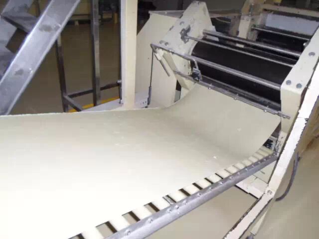 这个是将面团压成一张长长的面皮的机器,压成后的面皮会进行切割,切好后的面条经过机器的推拉就会变成弯弯曲曲的面条。