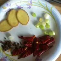 4. 麻油煸姜片,待四周稍稍卷起,下花椒和干辣椒爆香。其过程很呛人,请把抽油烟机开起来。怕呛得的同学可以晚点排骨和干辣椒一起下,没有那么呛了就。