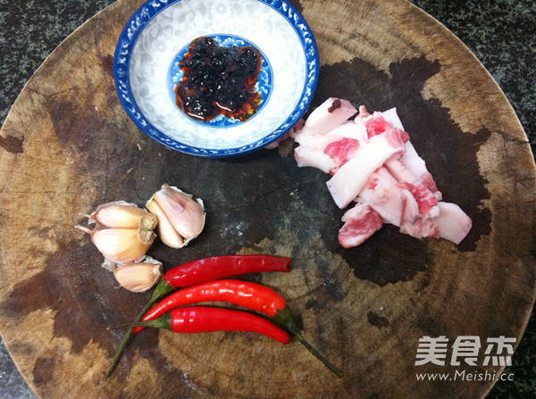 五花肉切片,蒜瓣拍扁去皮,辣椒洗净切片,取出老干妈豆豉辣椒酱