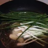 4. 油热后,放入一把香葱、姜片,炒出香味。