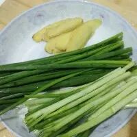 2. 生姜切成片,香葱保留长段,也可以完全不切断。
