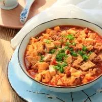 7. 然后加入豆腐块,不要用铲子翻板,轻轻的将豆腐推开即可,在煮4-5分钟,让豆腐完全入味。
