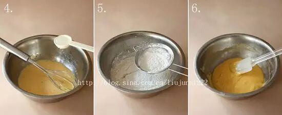 3、筛入面粉后不可划圈搅拌,以免面糊出筋,影响蛋糕口感,要用上下翻拌的方式;