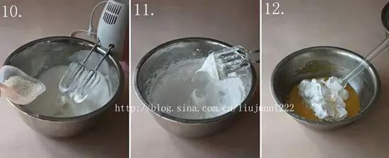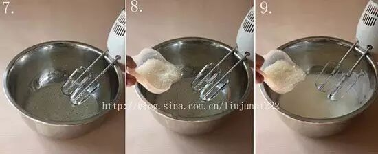 9.打至蛋清开始变浓稠时加入第二次糖(三分之一20克)